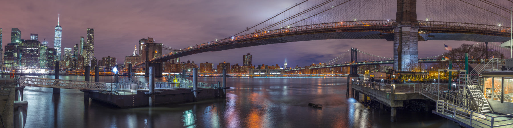 Brooklyn bridge over East river, New York. This stunning wallpaper showcases New York City's iconic bridges and skyline at twilight. The water reflects the vibrant lights, creating a sense of depth and drama. Hues of blue, purple, and orange blend seamlessly, adding a warm and inviting glow to any room. Use this wallpaper for walls to bring an urban edge to your living room, bedroom, or office. This design offers sophistication and makes a statement while still feeling calm and collected. It will be a great addition to your home decor.