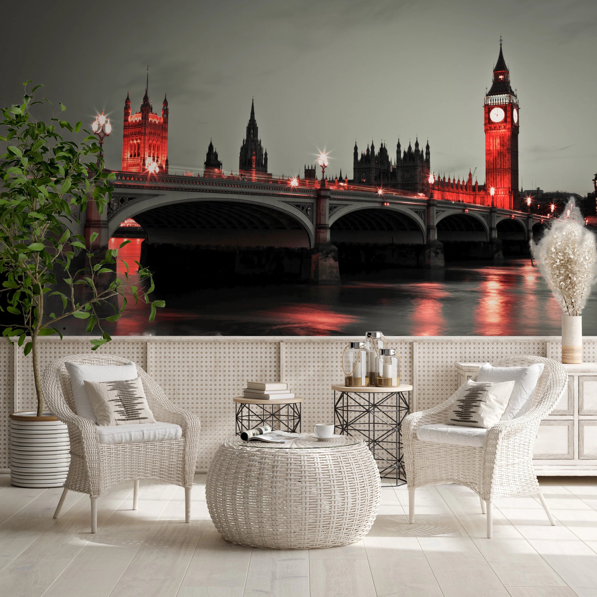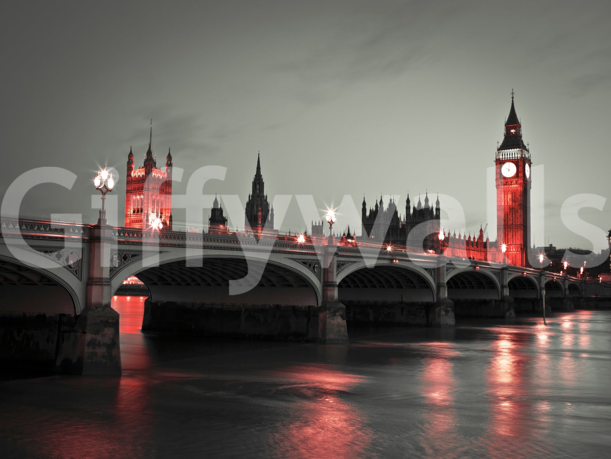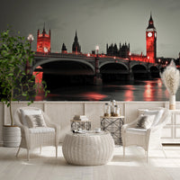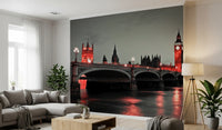 Westminster Bridge at night in London. Step into a realm of 'Night Magic' with this breathtaking wall décor. A majestic cityscape is bathed in an ethereal glow, casting an enchanting spell upon any room. The iconic architecture rises against the dusky twilight, its details rendered with a captivating monochromatic palette punctuated by striking, vibrant hues. The subtle interplay of light and shadow dances across the tranquil waters below, creating a mesmerising reflection that draws the eye deeper into the scene. The romantic glow evokes a sense of wonder and serenity, transforming your space into a sanctuary of sophistication. Infuse your living room, bedroom, or office with a touch of urban mystique and timeless elegance.