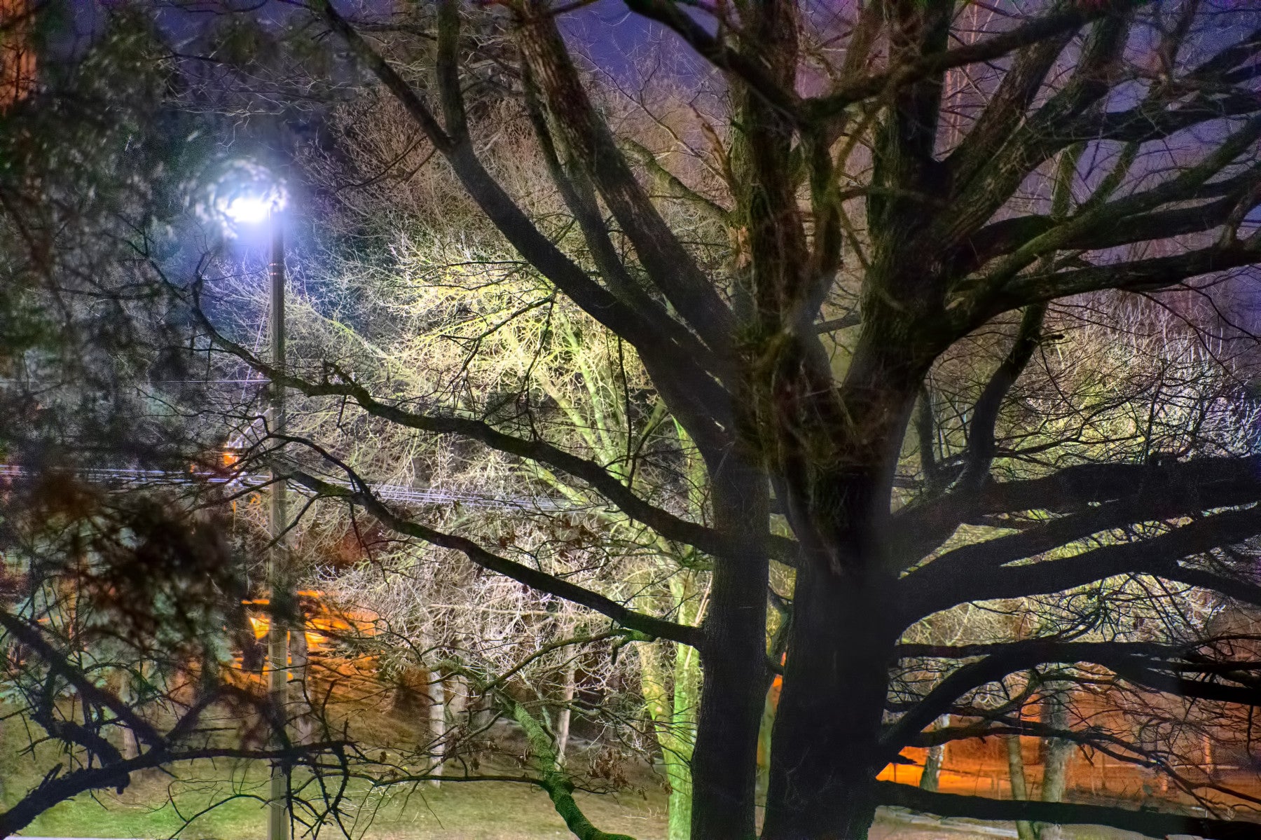 Softly illuminated branches and foliage.