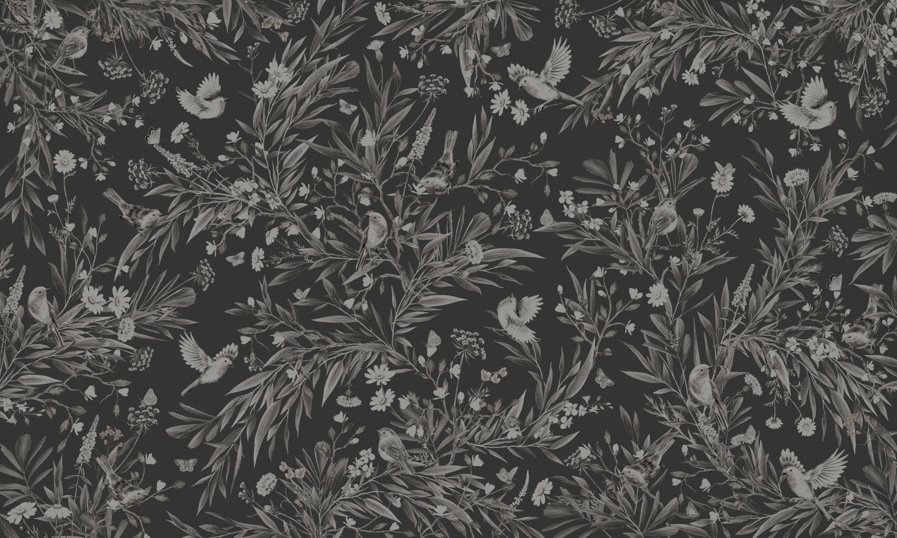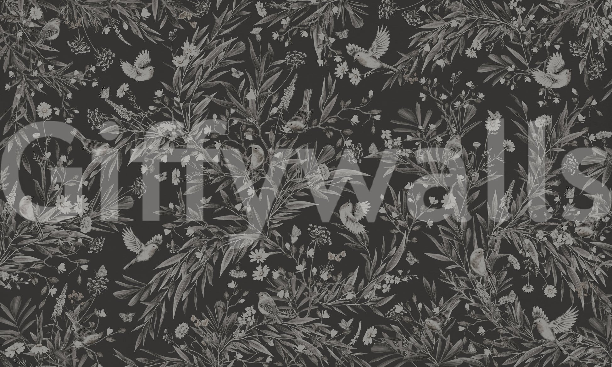 Transform your space with this refined wallpaper for walls, showcasing detailed botanical art. Leaves, flowers, and delicate birds form a seamless monochrome pattern against a dark backdrop. This design brings a touch of nature into your home, working wonderfully in a bedroom, living room, or hallway. Its quiet sophistication balances any decor, adding depth and texture with a calming atmosphere.