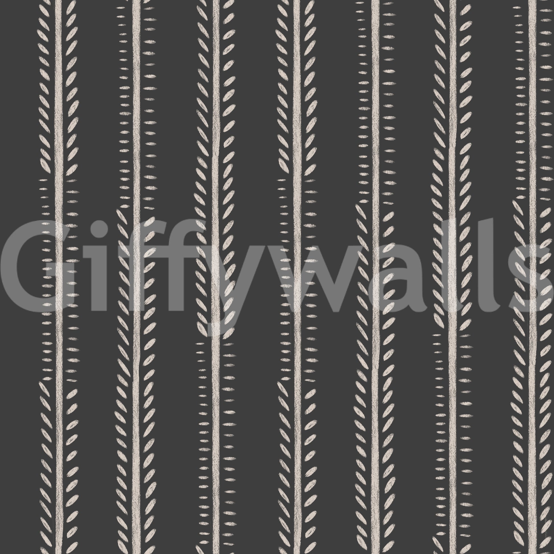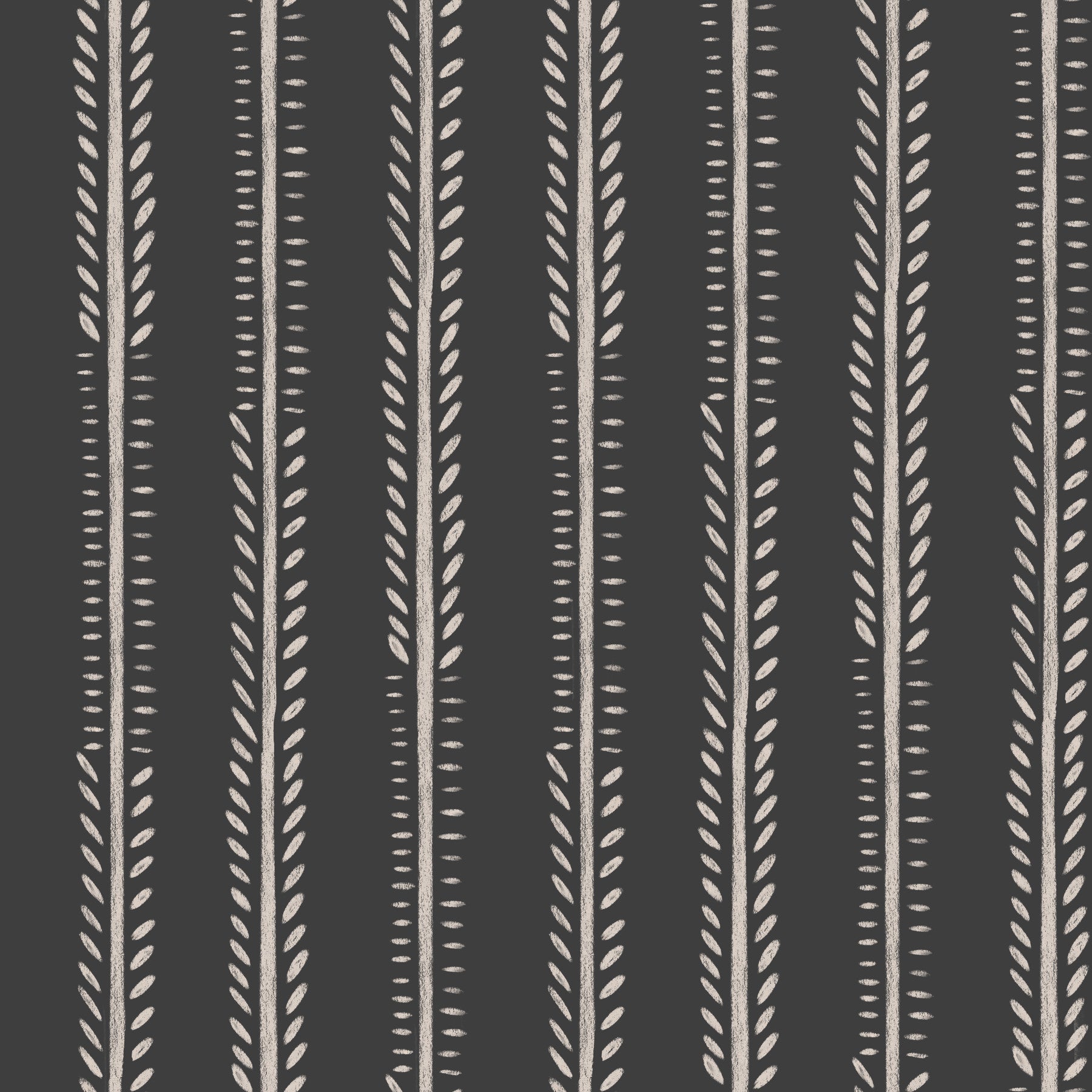 Nocturne Stripes offers a sophisticated and calming wallpaper design. The vertical stripes in a dark charcoal grey are punctuated by delicate, off-white leaf-like shapes creating a subtle, yet visually striking pattern. The hand-drawn feel and slightly textured appearance add warmth and character, resembling a unique chalk or paint effect. This versatile wallpaper is perfect for creating a serene ambiance in bedrooms, living rooms, or hallways. It seamlessly blends modern aesthetics with a touch of quiet elegance, providing a grounding and relaxing backdrop for any space.