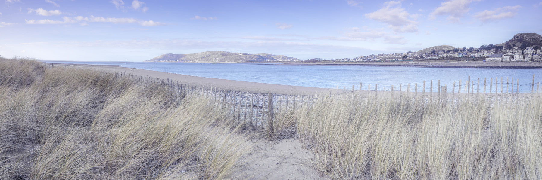 Beach on North wales coast. Bring the serenity of the seaside into your home with this panoramic beach wallpaper. This design features soft, sandy hues and gentle blue tones to capture the calm of the coast. The detailed fence and waving grass create depth, adding a realistic touch. Perfect for creating a relaxed vibe, this wallpaper for walls suits a bedroom, living room, or hallway. It enhances the natural light and brings a sense of openness to smaller spaces. Make your interiors feel like a peaceful retreat.