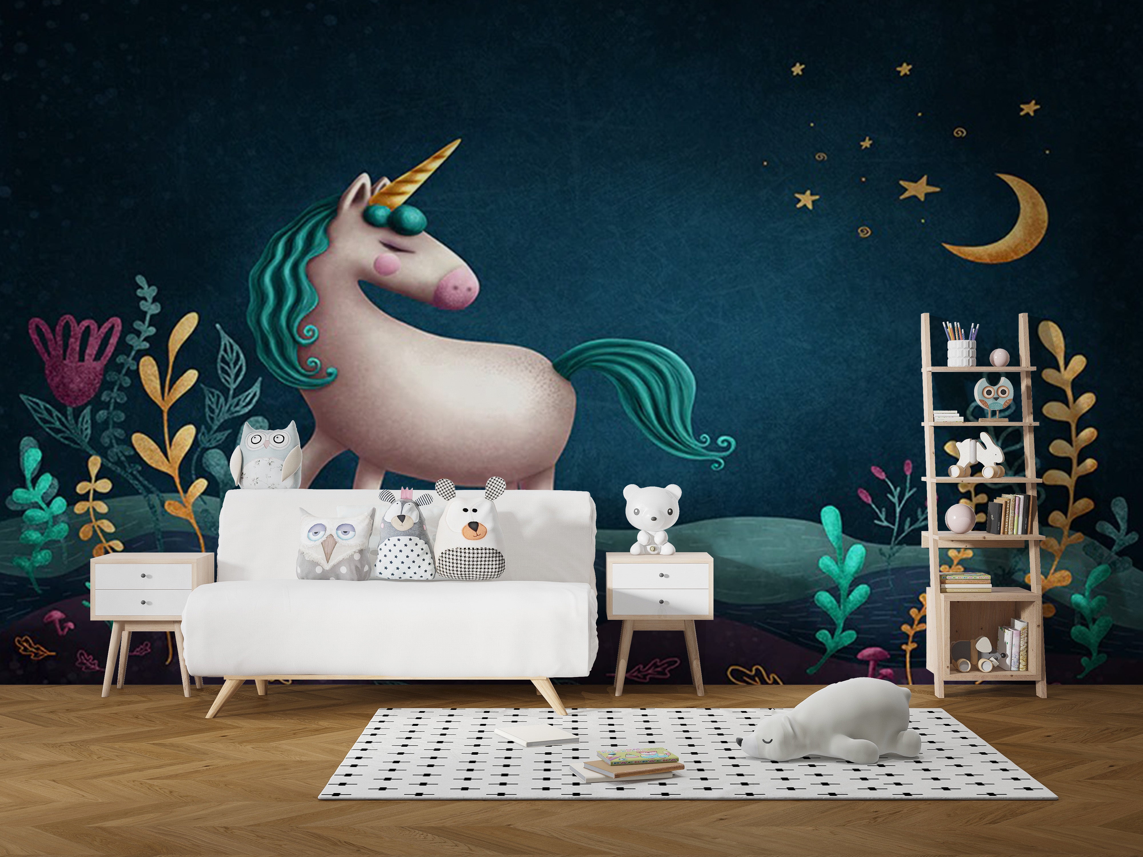Blue & Green Night Unicorn Kids Nursery Wallpaper Mural design