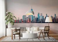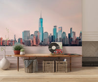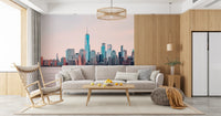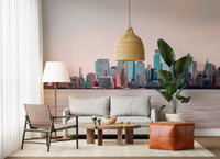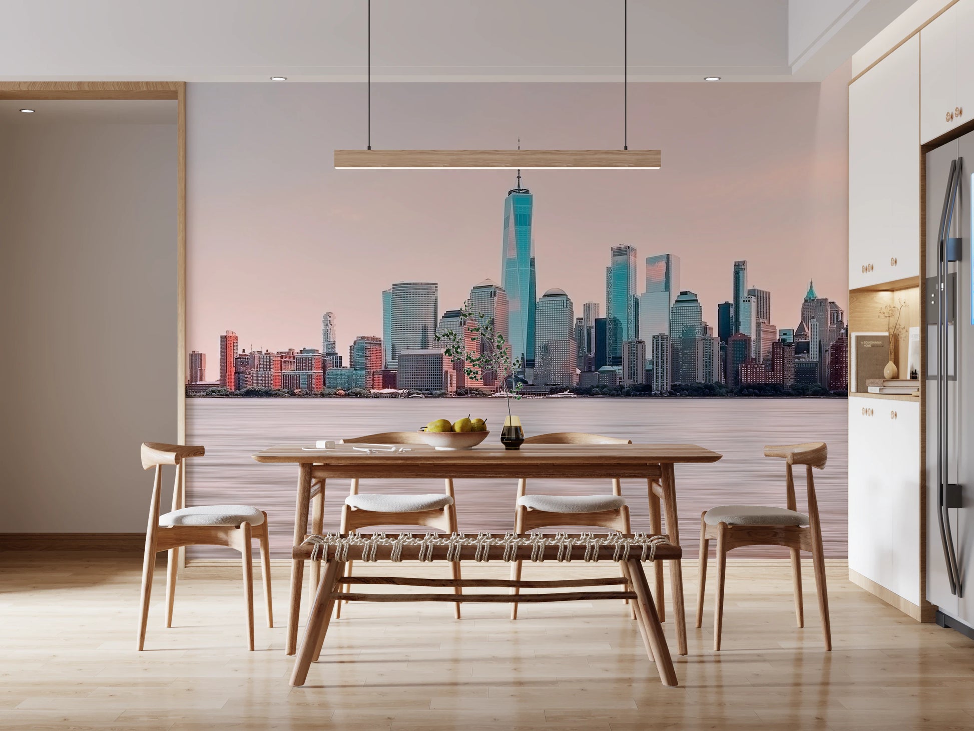Transform your space with this serene cityscape featuring the iconic New York City skyline. The soft, muted colour palette of pinks, blues and greys creates a calm and sophisticated atmosphere. The gentle water reflections add a sense of tranquility, making it suitable for bedrooms, living rooms, or even home offices. This wallpaper for walls brings the beauty of urban landscape to any room, enhancing it with a touch of modern elegance and understated grandeur. It works beautifully as a feature wall, instantly adding depth and visual interest to interior spaces.