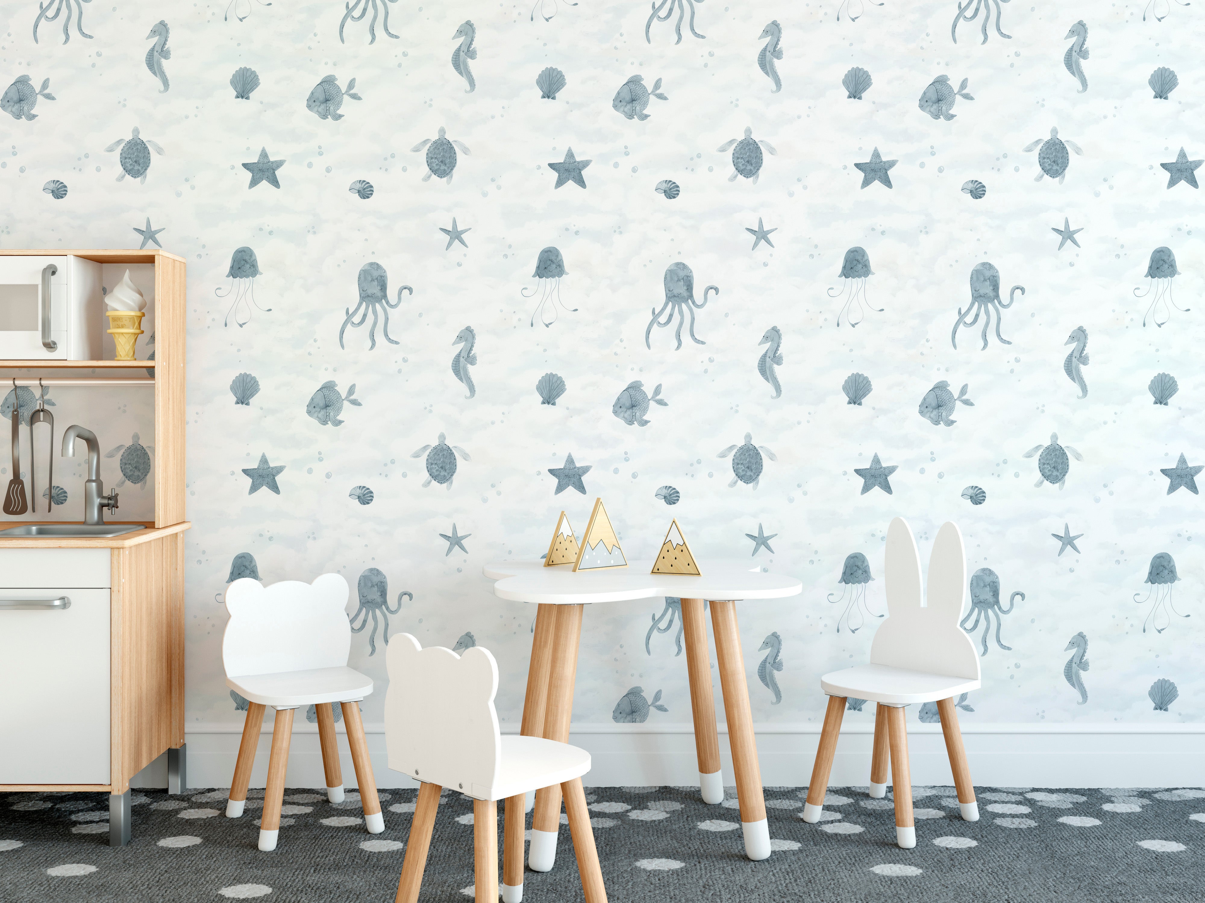 Embark on an oceanic journey right from your child's room! Our ocean friends adventure wallpaper invites a splash of marine magic into their personal haven. Dive into a world where playful dolphins, gentle turtles, and friendly octopuses swim alongside. This vibrant kids room wallpaper captures youthful imagination, making every day an underwater quest for discovery.