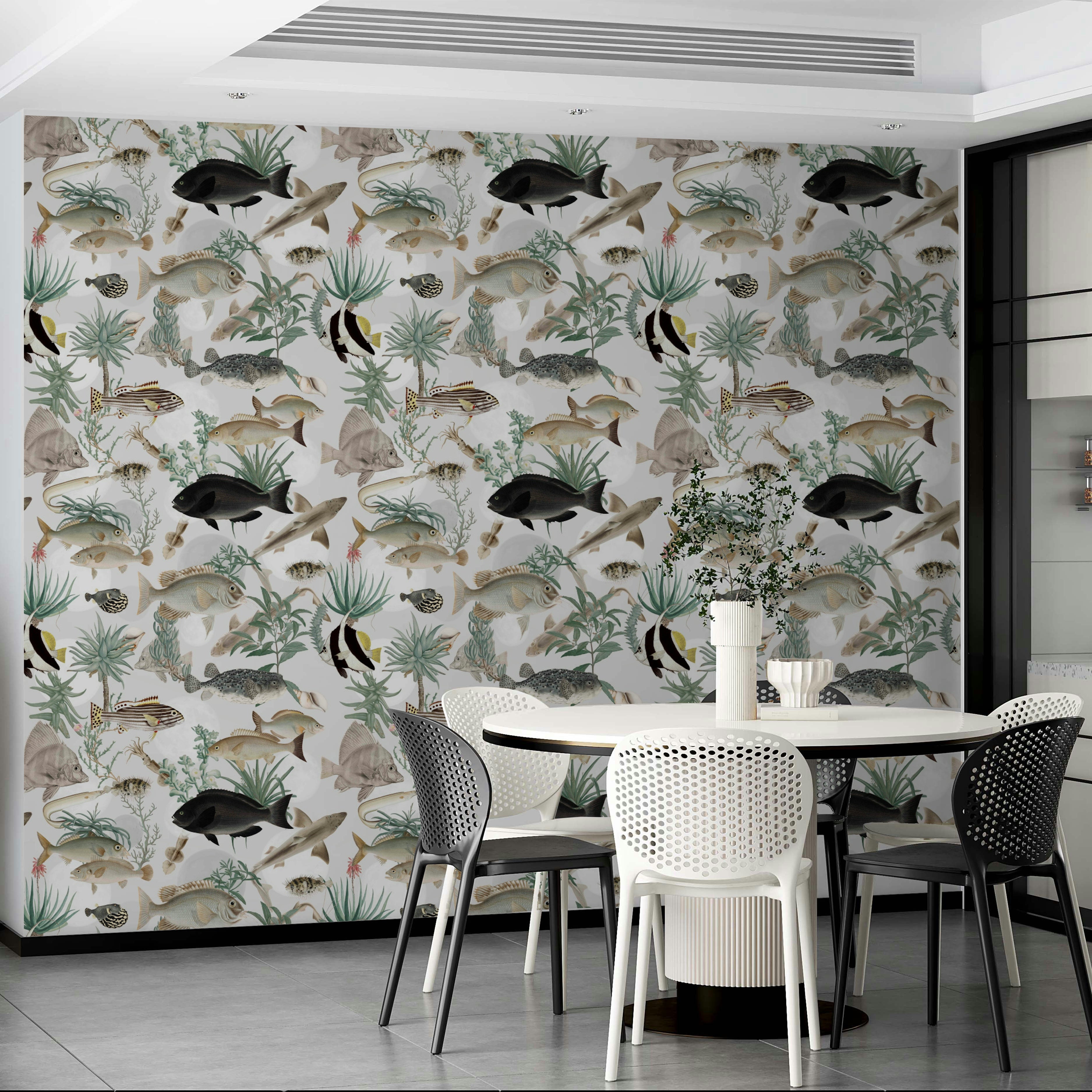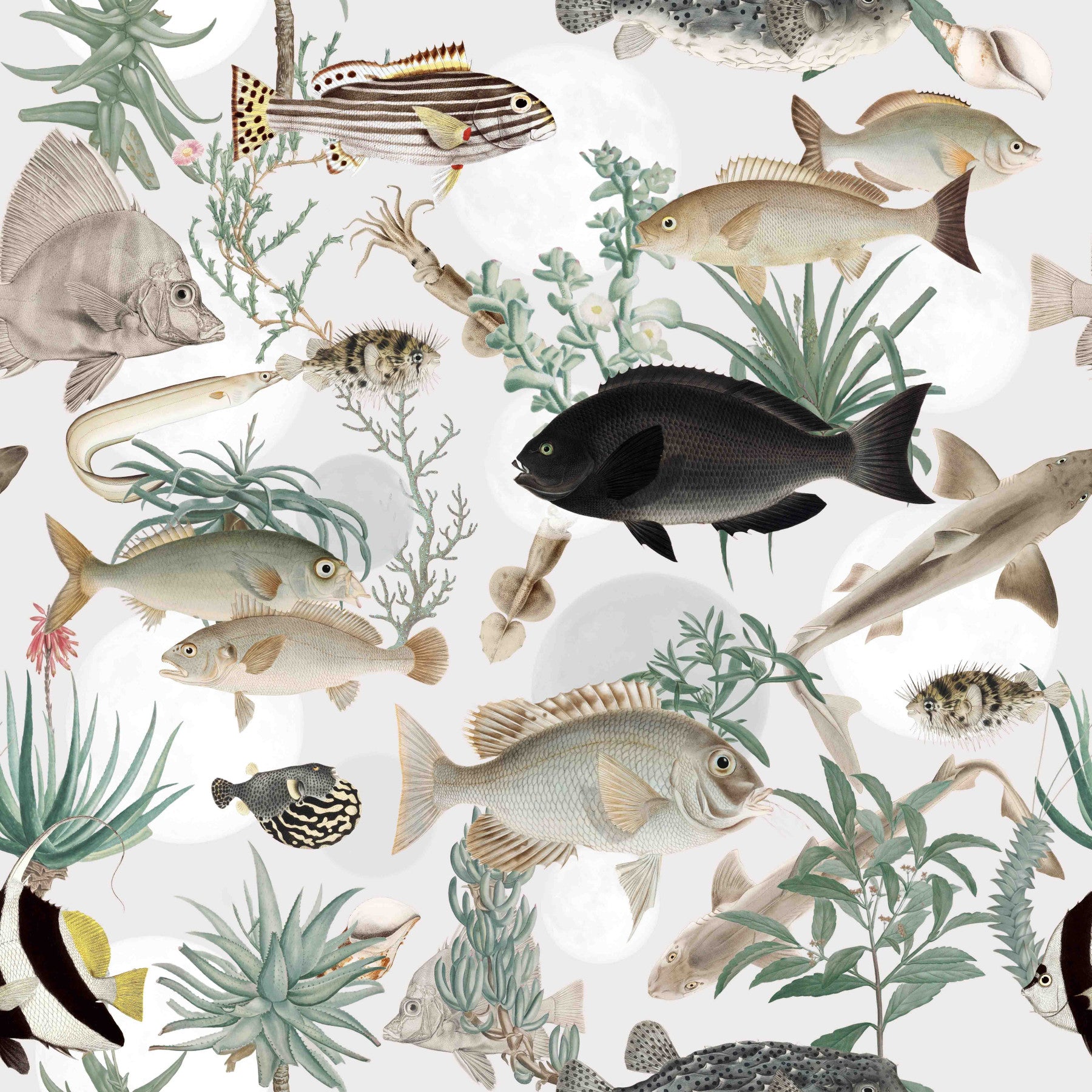 Dive into the depths of Oceania with this exquisitely detailed aquatic wallpaper. Showcasing a rich tapestry of marine life rendered in a vintage illustrative style, the design features diverse fish species, from striped snappers to sleek sharks and curious pufferfish, interspersed with lush aquatic flora. The soft, muted color palette evokes a sense of tranquility and timeless elegance. This wallpaper brings the vibrant ecosystems of the Pacific and surrounding oceans to your space, offering a serene and captivating glimpse into the underwater world, perfect for adding a touch of natural history and sophistication to any room.