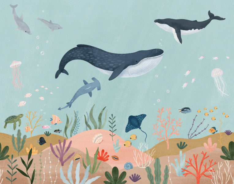 Dive into the depths of the ocean without leaving home! Our oceanic adventure wall mural turns your child's room into a marine haven. Colorful fish, gentle whales, and intricate coral reefs create a playful yet serene underwater tableau, sparking curiosity and dreams of aquatic adventures. This vibrant kids nursery wallpaper invites young imaginations on a captivating journey beneath the waves. Perfect for a nurturing, educational backdrop, it's a splash of fun for any young oceanographer's bedroom.