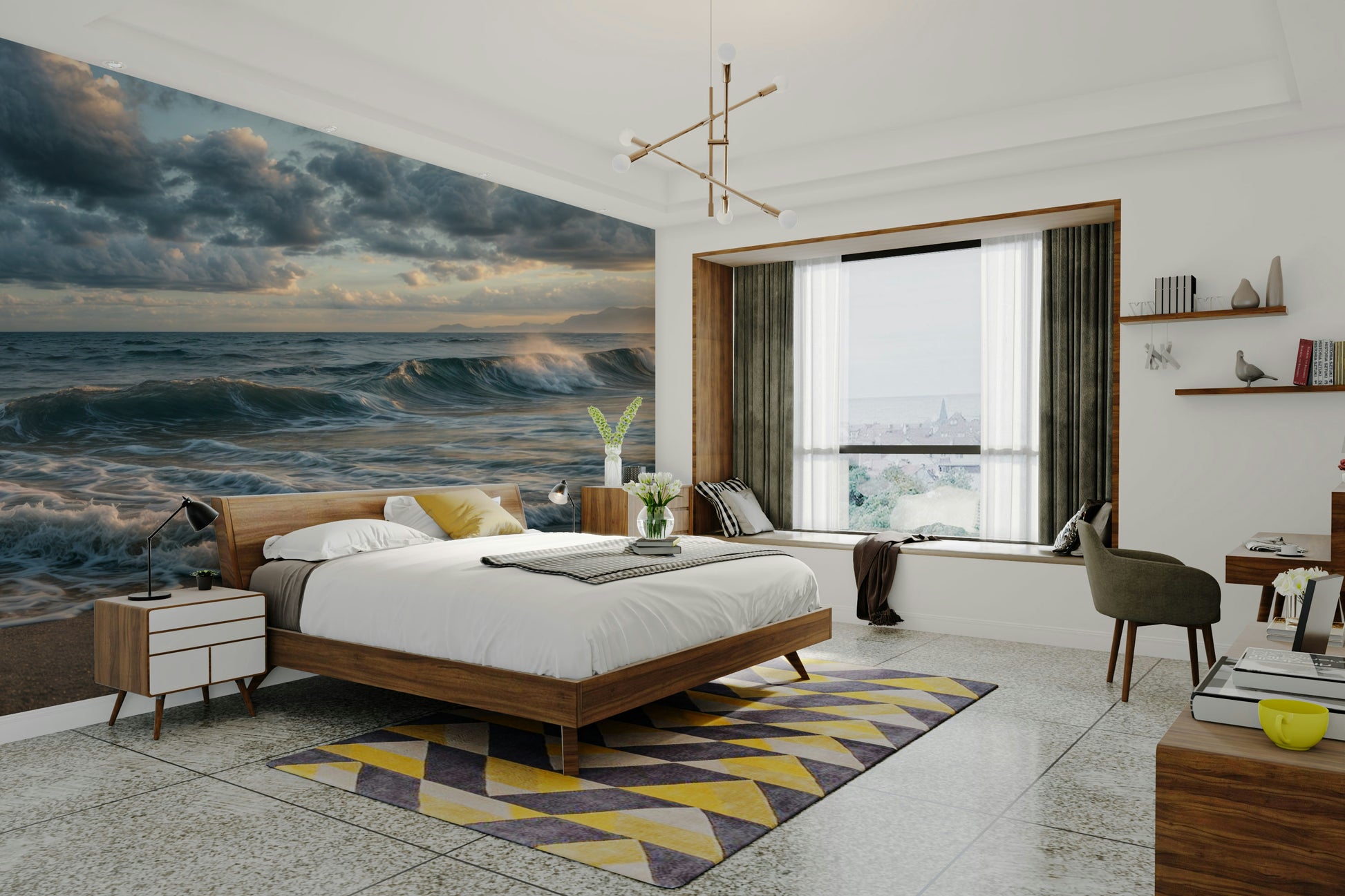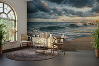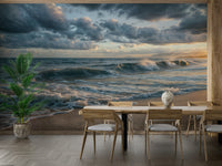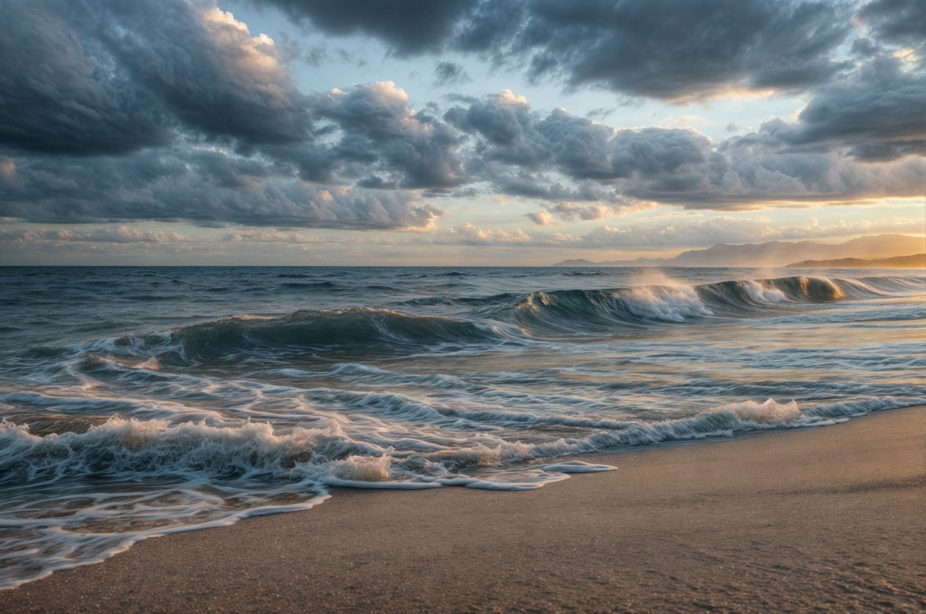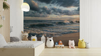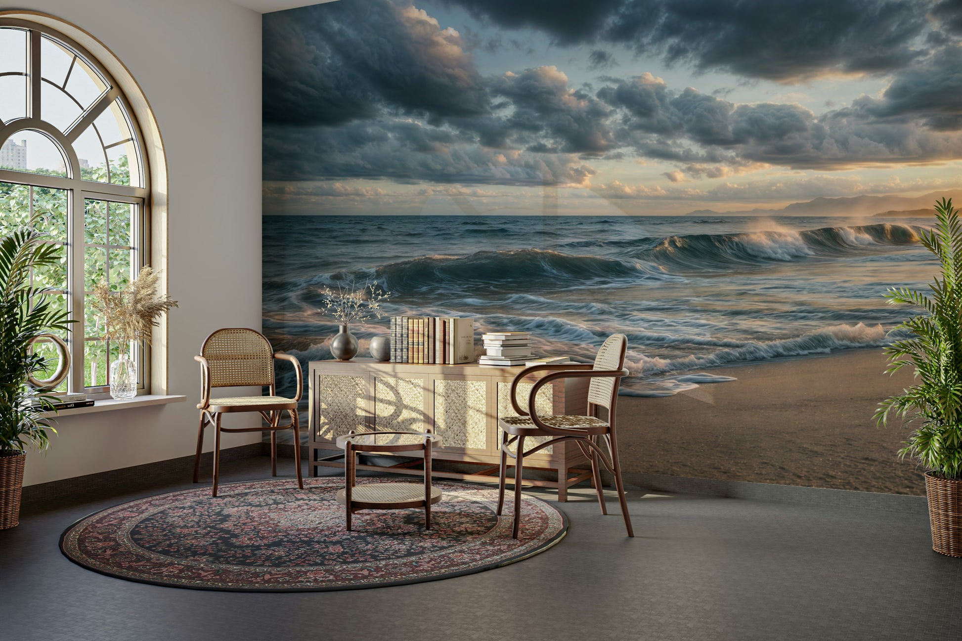This wallpaper invites you to feel the calming embrace of the ocean. The photo beautifully captures the rhythmic motion of waves gently rolling onto a pristine sandy beach, illuminated by the warm, fading light of a sunset. The combination of dark, heavy clouds and the soft pastel tones of the sky creates a compelling and serene visual story. Perfect for bringing a peaceful atmosphere to any space, this wallpaper transports you to a tranquil coastal haven.