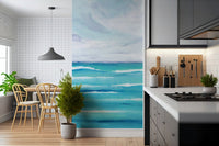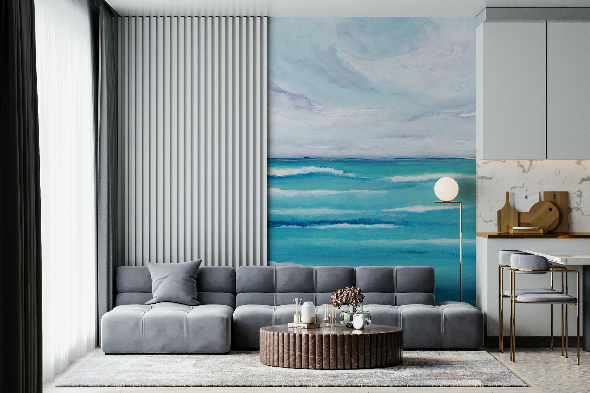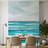 Immerse yourself in the calming beauty of 'Ocean's Embrace,' a stunning wallpaper depicting a breathtaking seascape. The artwork's delicate brushstrokes capture the subtle movement of the waves, creating a soothing visual rhythm. The cool palette of blues and greens, punctuated by hints of white, evokes a feeling of serenity and escape. Perfect for bedrooms, living rooms, or any space where you desire a tranquil ambiance, this wallpaper seamlessly blends artistry with a calming atmosphere. The abstract nature of the piece ensures versatility, fitting seamlessly into modern and classic interior design schemes alike. Let the gentle ebb and flow of the ocean wash over you, bringing a touch of coastal serenity to your home.
