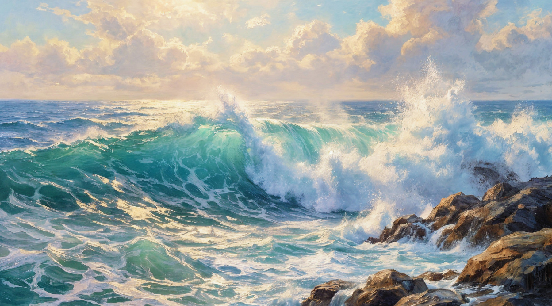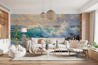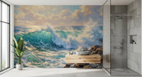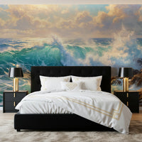 Bring the power and beauty of the ocean into your home with this captivating wallpaper for walls. This design showcases a dynamic wave crashing against rocky shores under a sky of soft, luminous clouds. The colour palette of turquoise, white, and beige creates a calming yet energetic atmosphere. This wallpaper works wonderfully in living rooms, bedrooms, or bathrooms, adding a touch of natural elegance. Its dramatic scenery enhances spaces, making them feel larger and more connected to the outdoors.