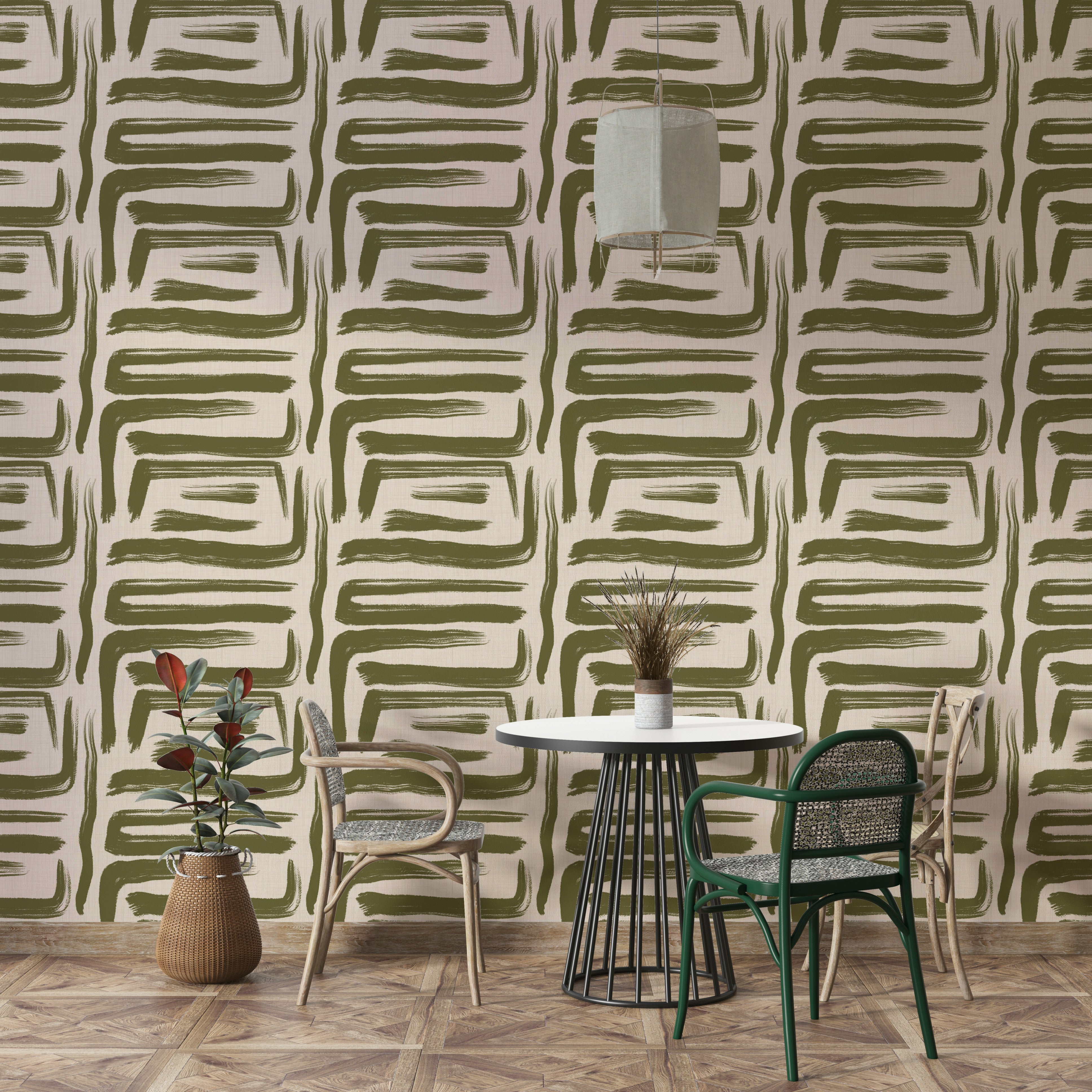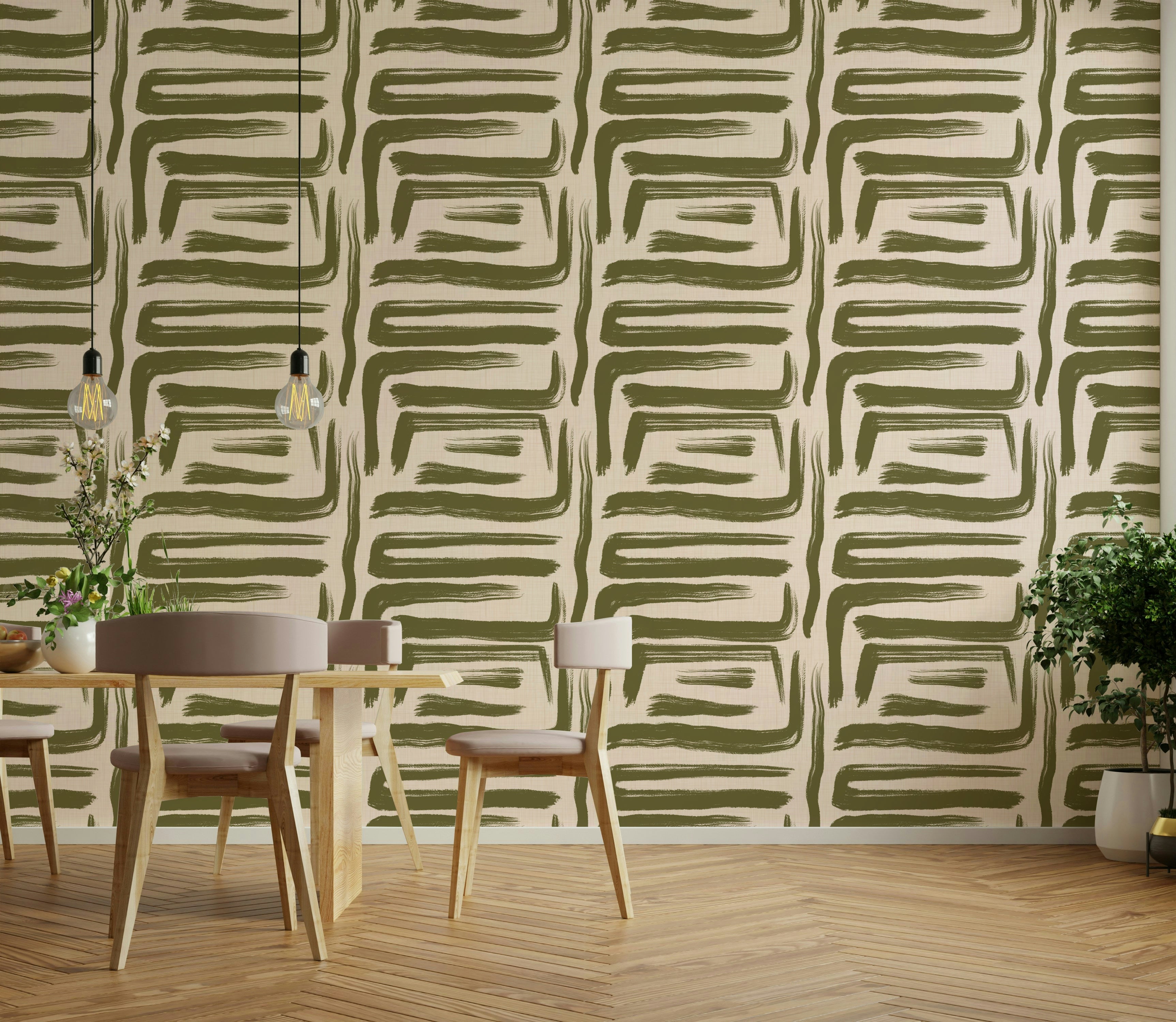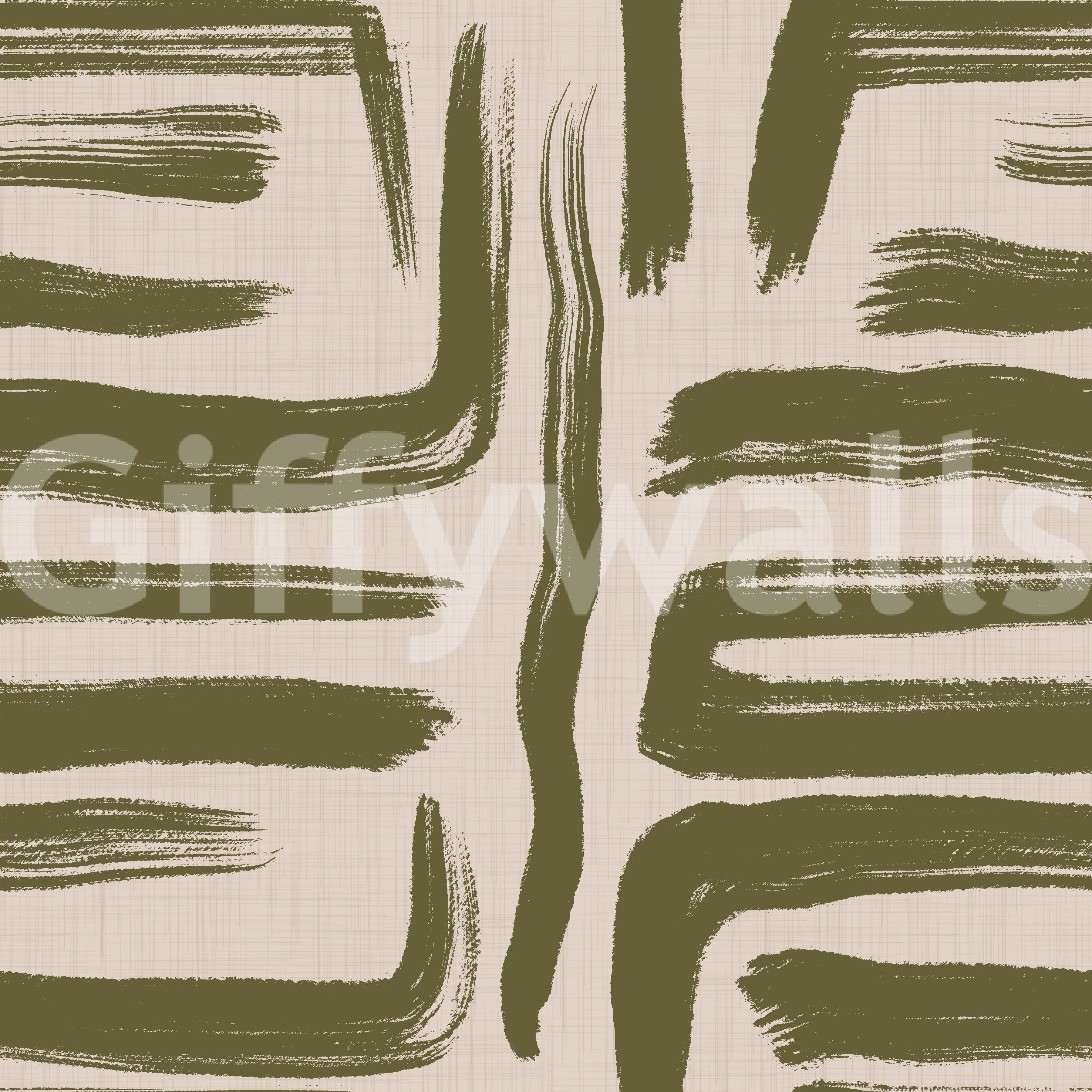 Embrace mid-century modern style with this captivating wallpaper. Bold, olive green brushstrokes in varying widths and directions create a dynamic, abstract pattern against a subtle beige linen texture. The interplay of organic brushwork and geometric undertones evokes a sense of calm sophistication. This design effortlessly blends organic texture with clean lines, making it a perfect choice for adding a touch of artistic flair to any space, from a living room to a home office. The earthy olive tones create a soothing atmosphere, while the dynamic brushstrokes add visual interest and a modern edge.