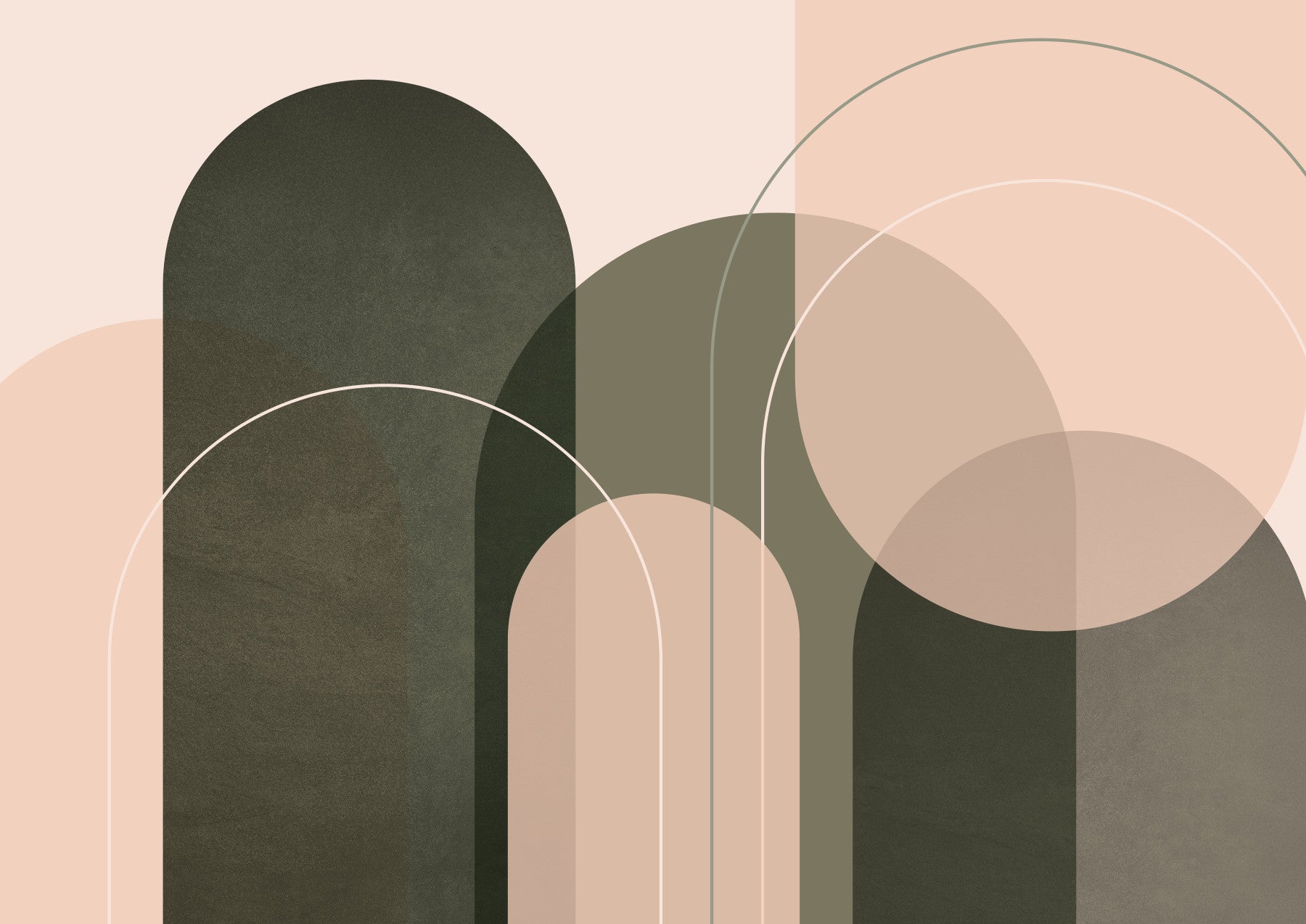 Embrace tranquility with this wallpaper's understated elegance. The design features a series of overlapping arches and circles in a palette of soft blush pinks, muted greens, and subtle grays. The interplay of organic shapes and clean lines creates a calming visual rhythm, ideal for spaces where relaxation and mindfulness are paramount. This wallpaper is versatile enough to complement a variety of interior styles, adding a touch of sophistication without overpowering the room. Its muted color scheme promotes a sense of peace and serenity, making it perfect for bedrooms, living rooms, or even home offices.