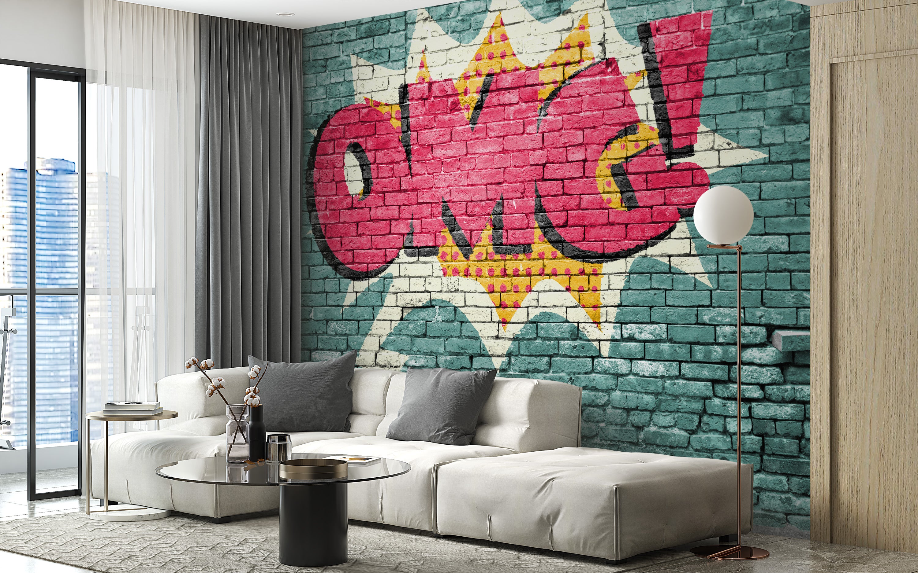 Experience a burst of retro flair with the pop art omg graffiti wall mural, a piece that brings the audacious spirit of pop art to life. This art wallpaper features bold lettering and exuberant designs that mimic the explosive pop art style, set against a faux brick wallpaper mural for an added urban edge. The iconic "OMG" exclamation makes a playful yet impactful statement, infusing any room with a sense of fun and excitement. Ideal for creating a standout feature wall, this mural is perfect for those looking to infuse their space with the vibrant, irreverent vibe of pop culture and street art fusion.