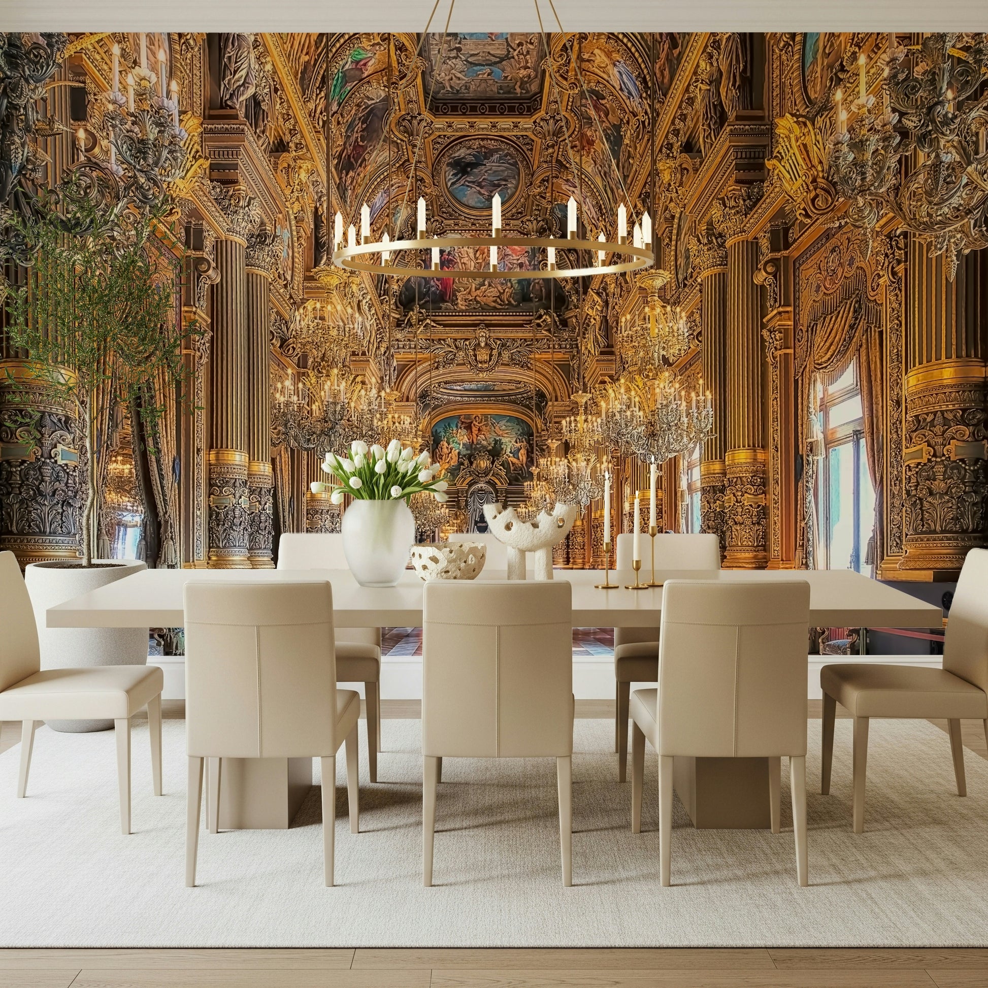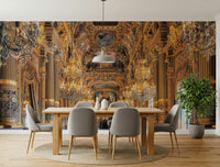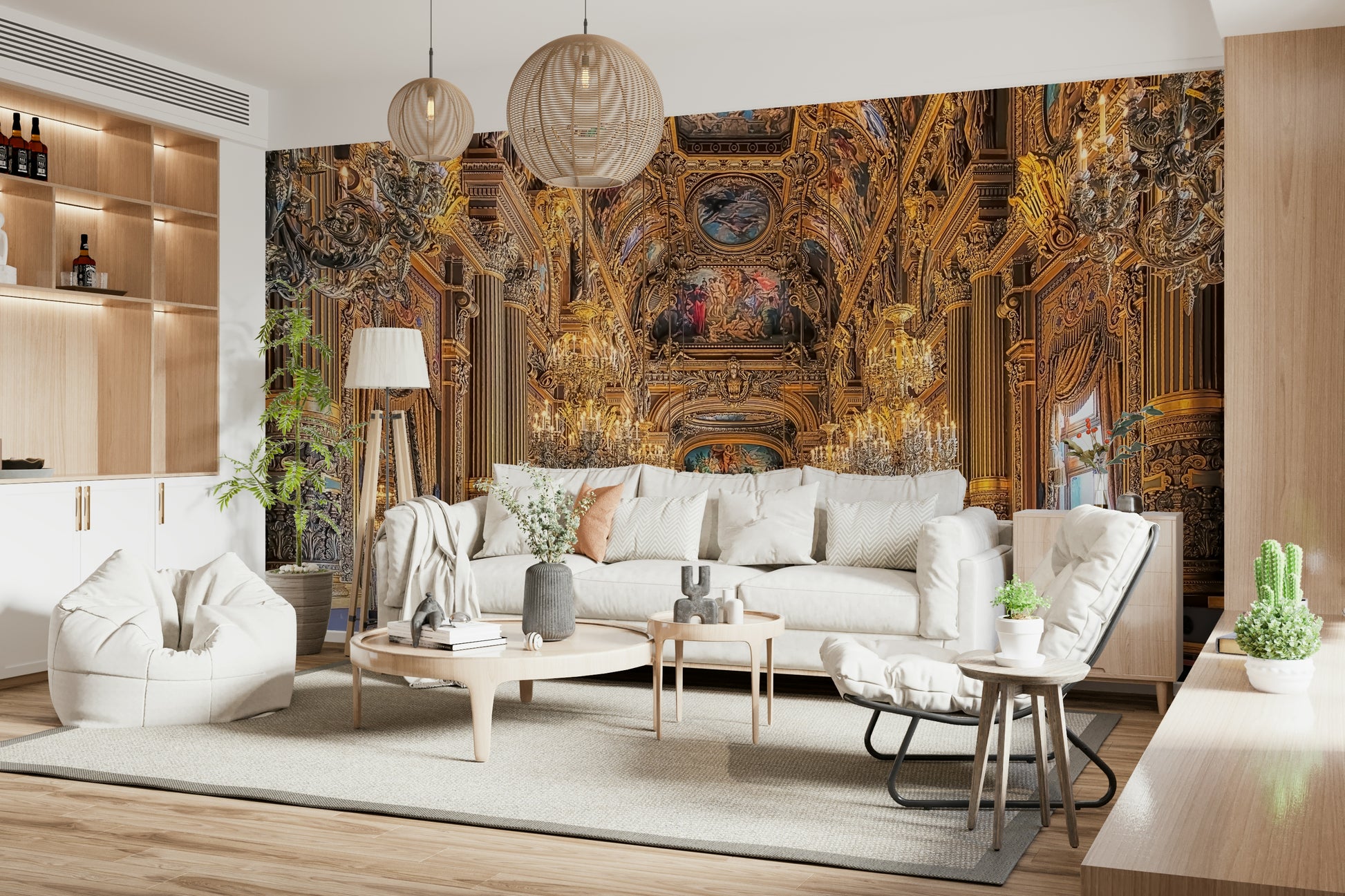Immerse yourself in the golden age with this wallpaper for walls. The ornate design brings a touch of classical beauty to any room. Columns, chandeliers, and detailed paintings create a luxurious effect. Gold and brown tones lend a rich, warm ambiance. This wallpaper creates a sense of grandeur. Consider this design for formal living rooms, dining rooms, or studies. It enhances interiors with a sophisticated, timeless style. It adds a touch of drama and elegance.