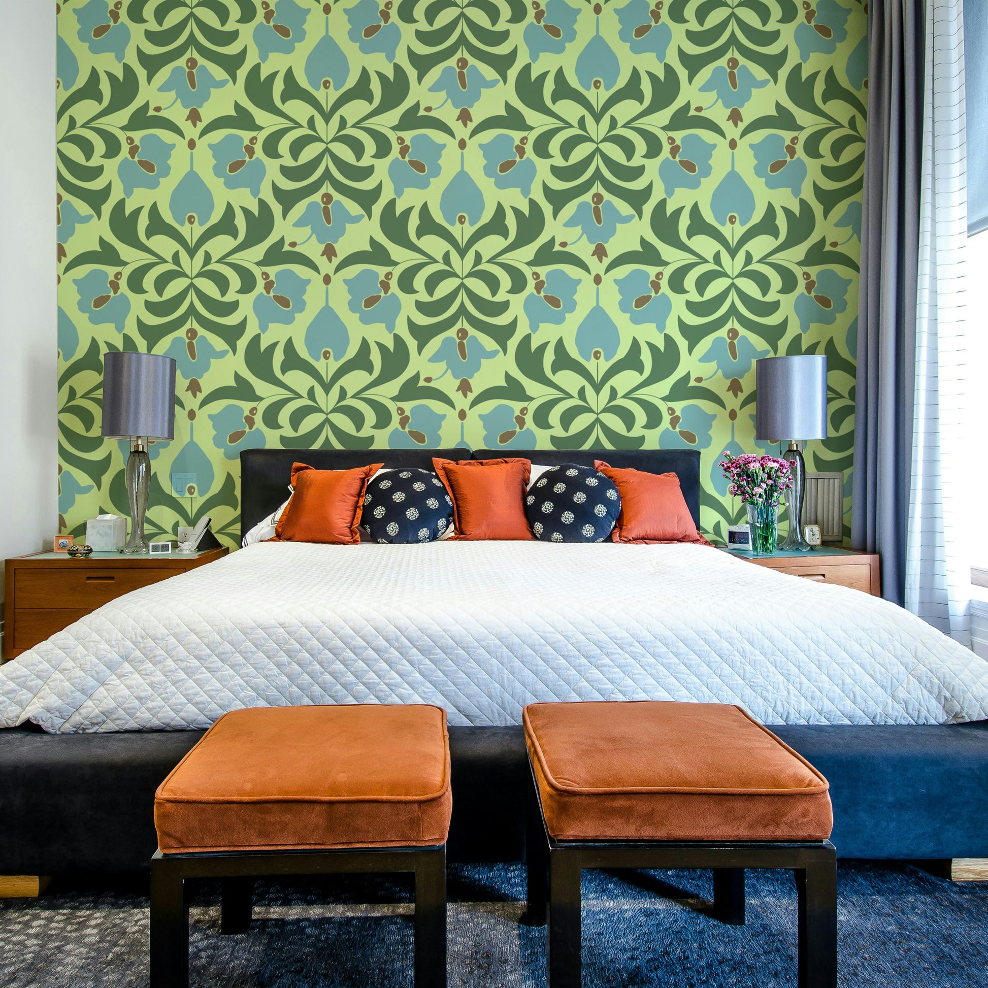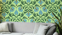 Give your space a refreshing update with this balanced botanical design! The wallpaper showcases a pattern of symmetrical light blue floral shapes and green leafy elements, all on a light green field. Ideal for creating a relaxing vibe in your bedroom, living area, or hallway, this wallpaper for walls incorporates a retro floral look. Its balanced style pairs well with different decor schemes. Refresh your space with this nature-inspired wall decor that combines simple elegance with timeless appeal.