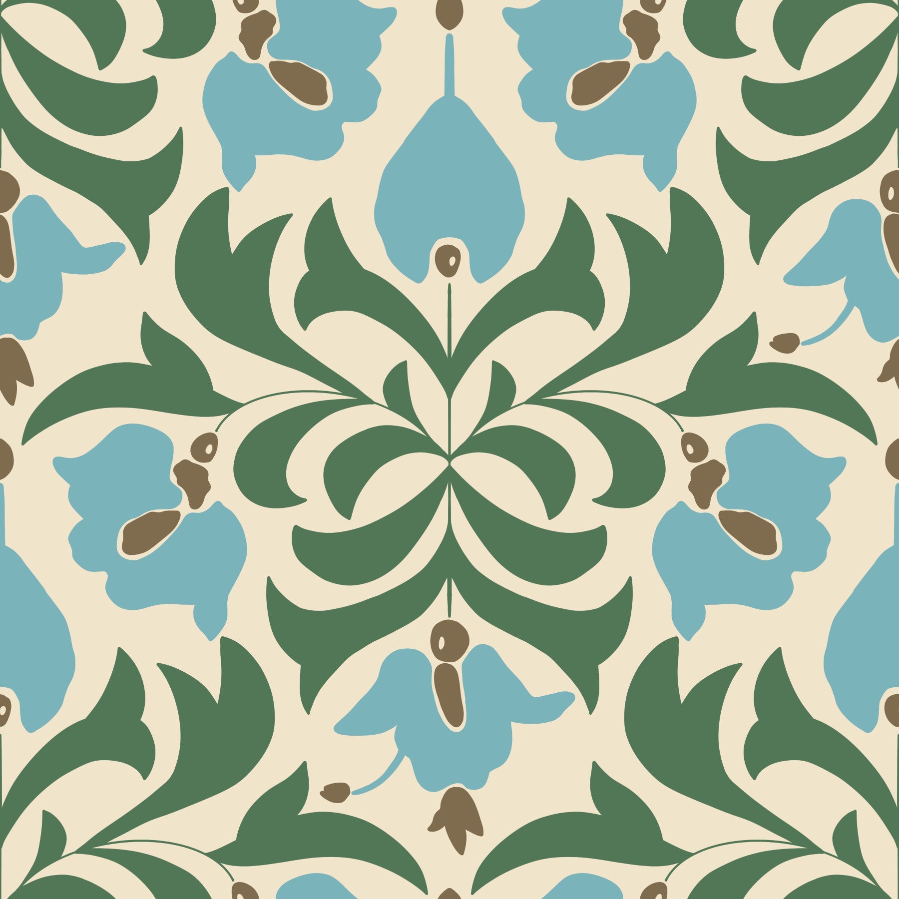 Refresh your interiors with this elegant wallpaper. Stylised flowers and leaves form a symmetrical pattern in soft teal, green, and beige. The even pattern creates a sophisticated atmosphere that complements a variety of interiors. This wallpaper for walls works best in bedrooms and dining areas because it offers a calming backdrop. With its peaceful colours, this lovely wallpaper enhances the design and atmosphere of your house, turning it into a tranquil and welcoming space.