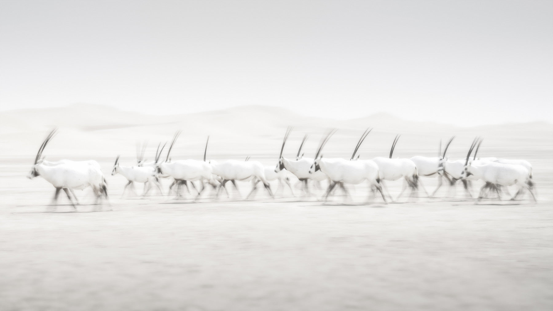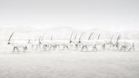 Drift into a serene world with 'Oryx Mirage', a minimalist wallpaper that evokes the ethereal beauty of the desert. This artwork presents a herd of majestic Oryx, their forms softened by a heat haze, creating a mirage-like effect. The stark white palette against the pale backdrop emphasises the animals' elegant silhouettes and their prominent, spiralling horns. The intentional blurring creates a sense of movement and mystery, suggesting a fleeting vision in the arid landscape. This wallpaper adds a touch of tranquil sophistication to your screen, inviting contemplation and a momentary escape to the heart of the desert's enigmatic allure. Let your device reflect your appreciation for understated elegance and the captivating power of nature's illusions.