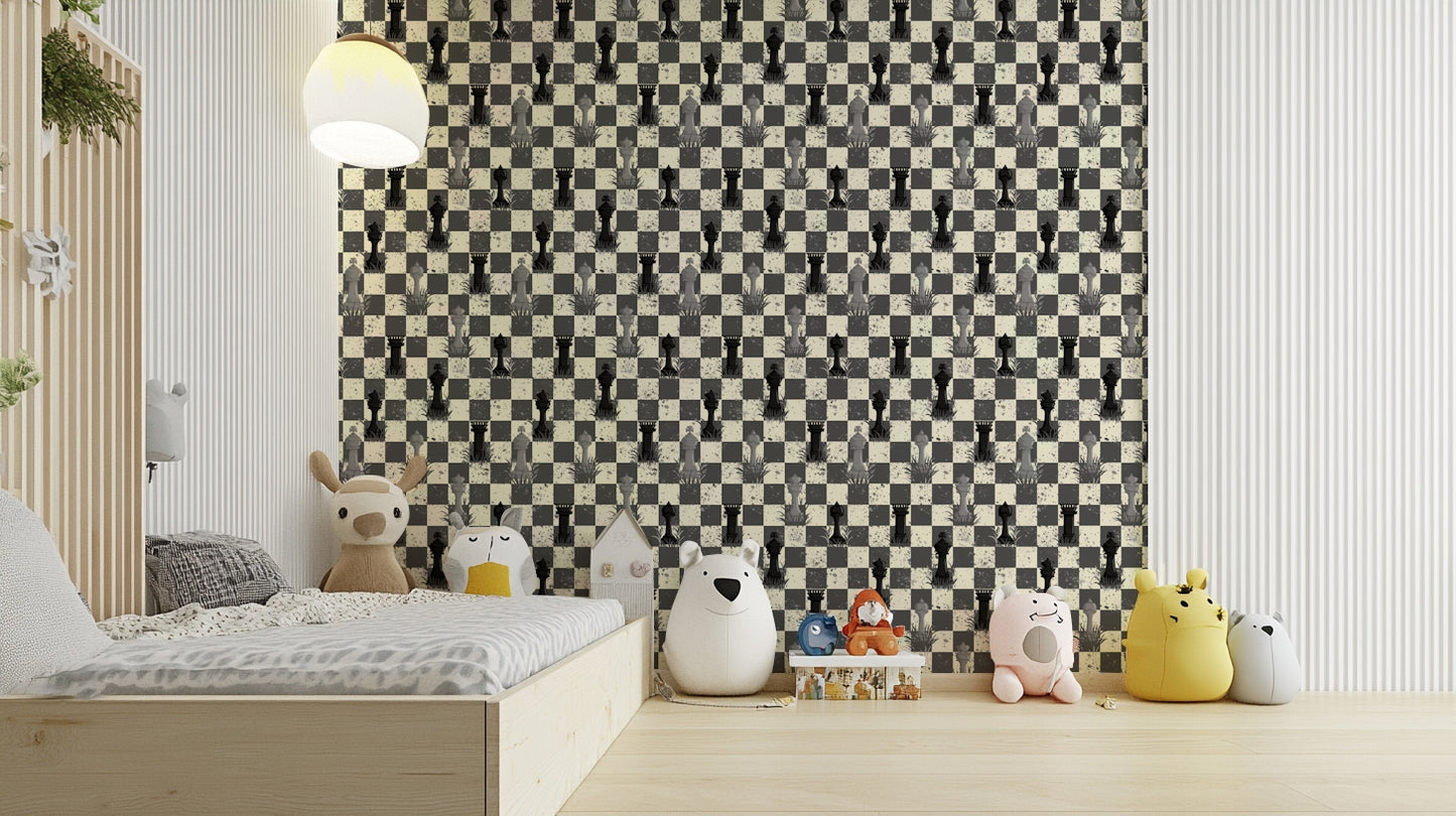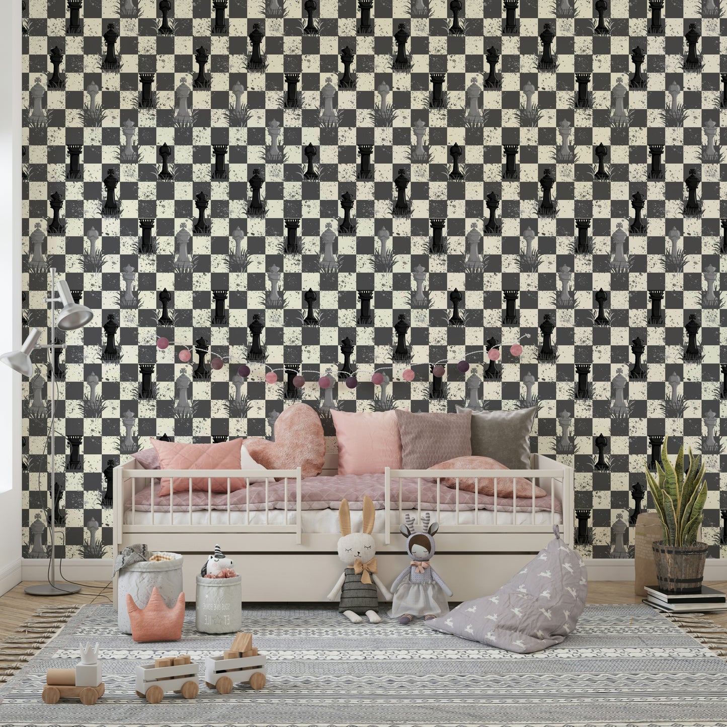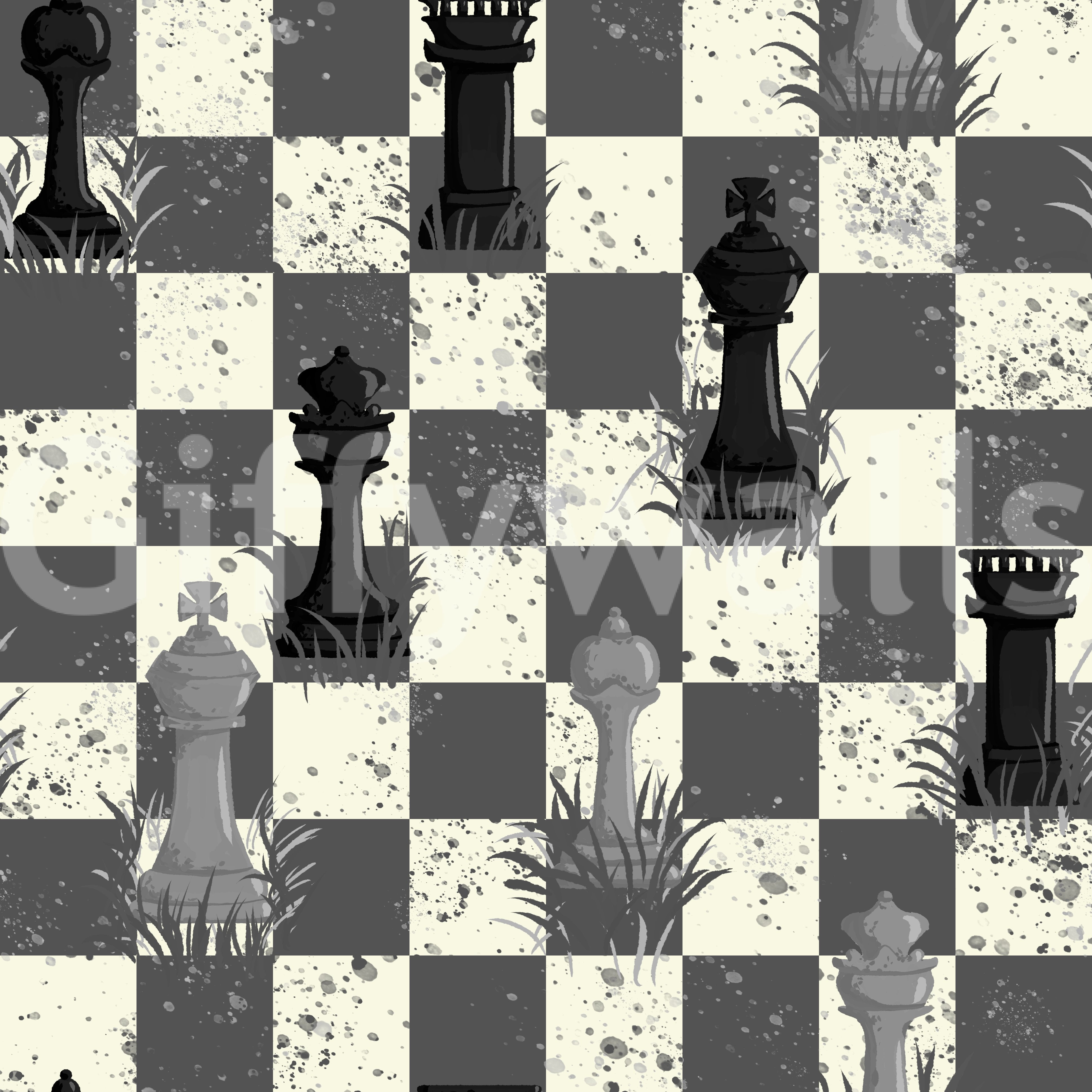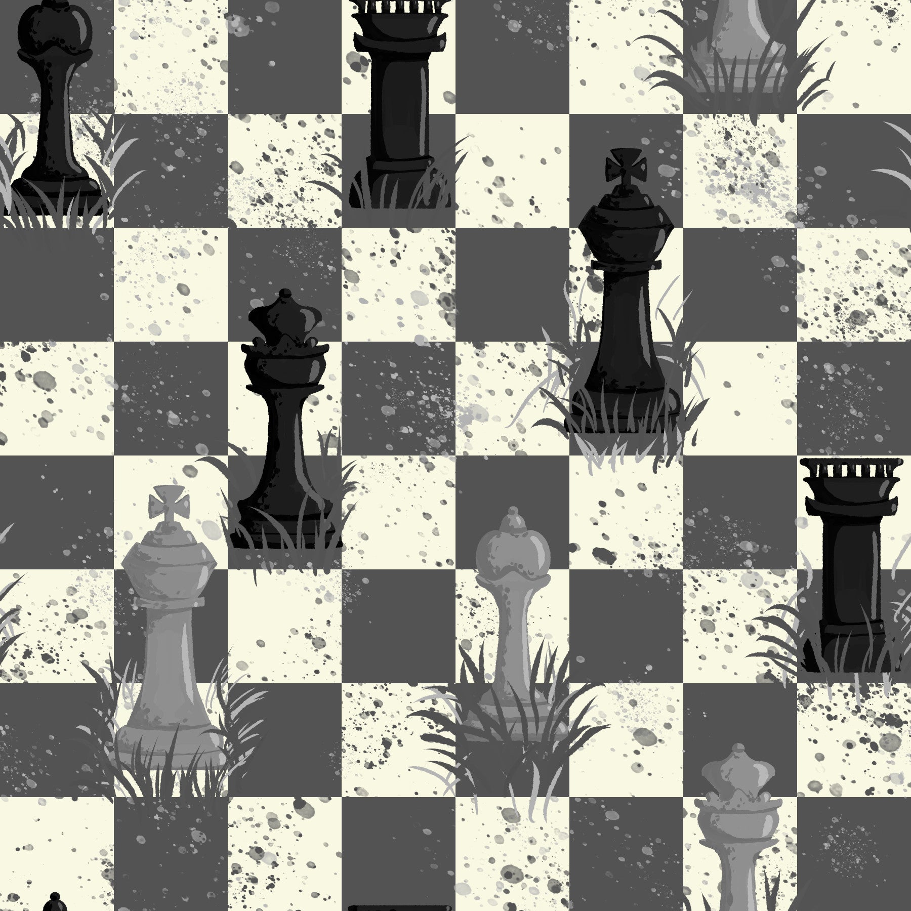 A captivating grayscale wallpaper depicting a chessboard scene, subtly infused with an outdoor ambiance. Chess pieces, rendered in varying shades of gray, appear to emerge from patches of stylized grass, adding a unique twist to the classic game. The chessboard itself is overlaid with a textured, paint-splattered effect, creating a sense of age and weathered charm. This striking contrast between the sharp lines of the chess pieces and the organic texture of the background offers a visually compelling and sophisticated design perfect for adding a touch of strategic elegance to your desktop.