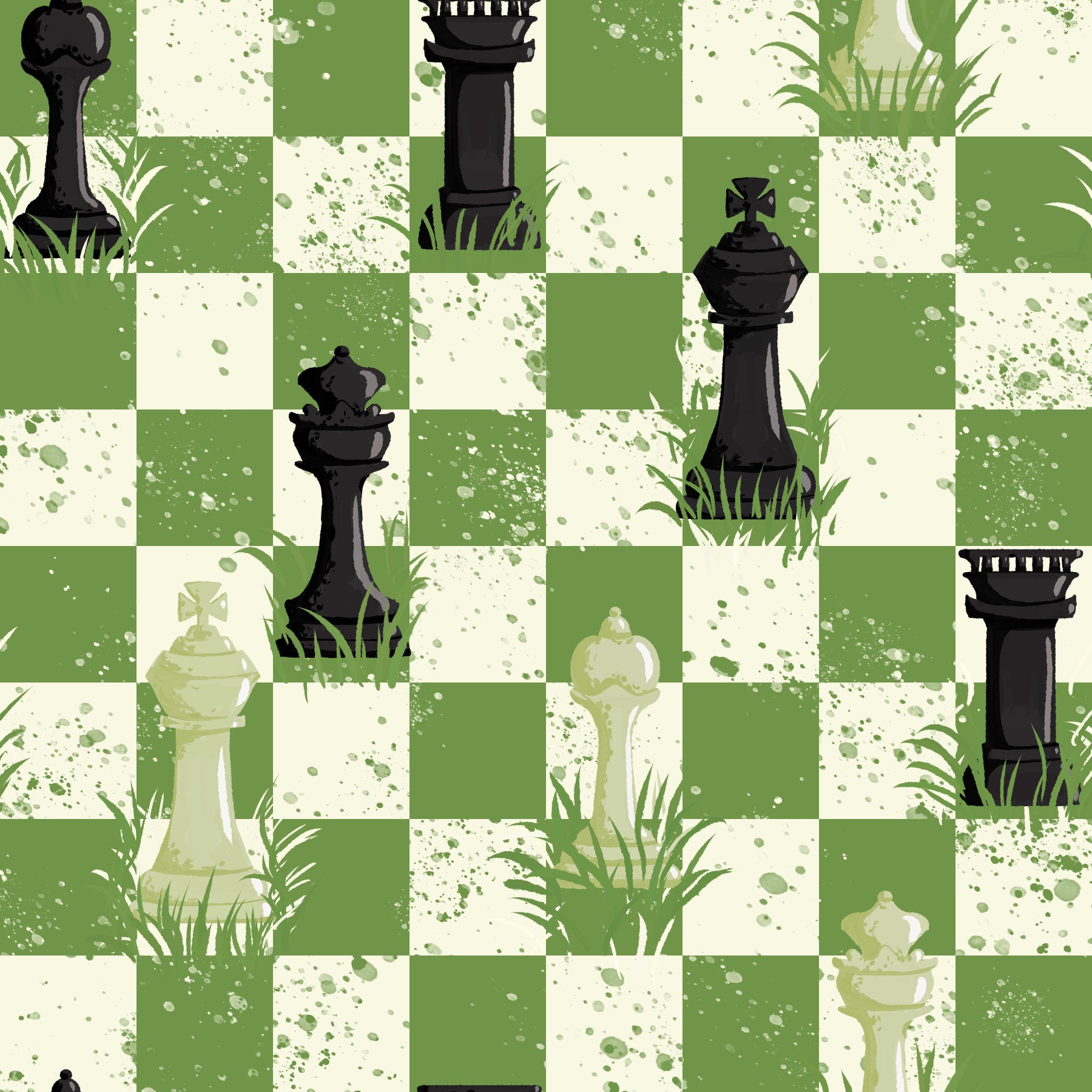 A serene and stylish wallpaper featuring an outdoor chessboard rendered in calming greens and creamy off-whites. Chess pieces, seemingly grown into the lush grass, add a whimsical touch. The distressed, paint-splattered texture lends a unique, artistic feel, evoking a sense of relaxed strategy and a peaceful, natural setting. This design is perfect for those who appreciate a blend of classic strategy and nature's calming embrace. The soft color palette creates a soothing atmosphere ideal for a tranquil workspace or a peaceful living room.