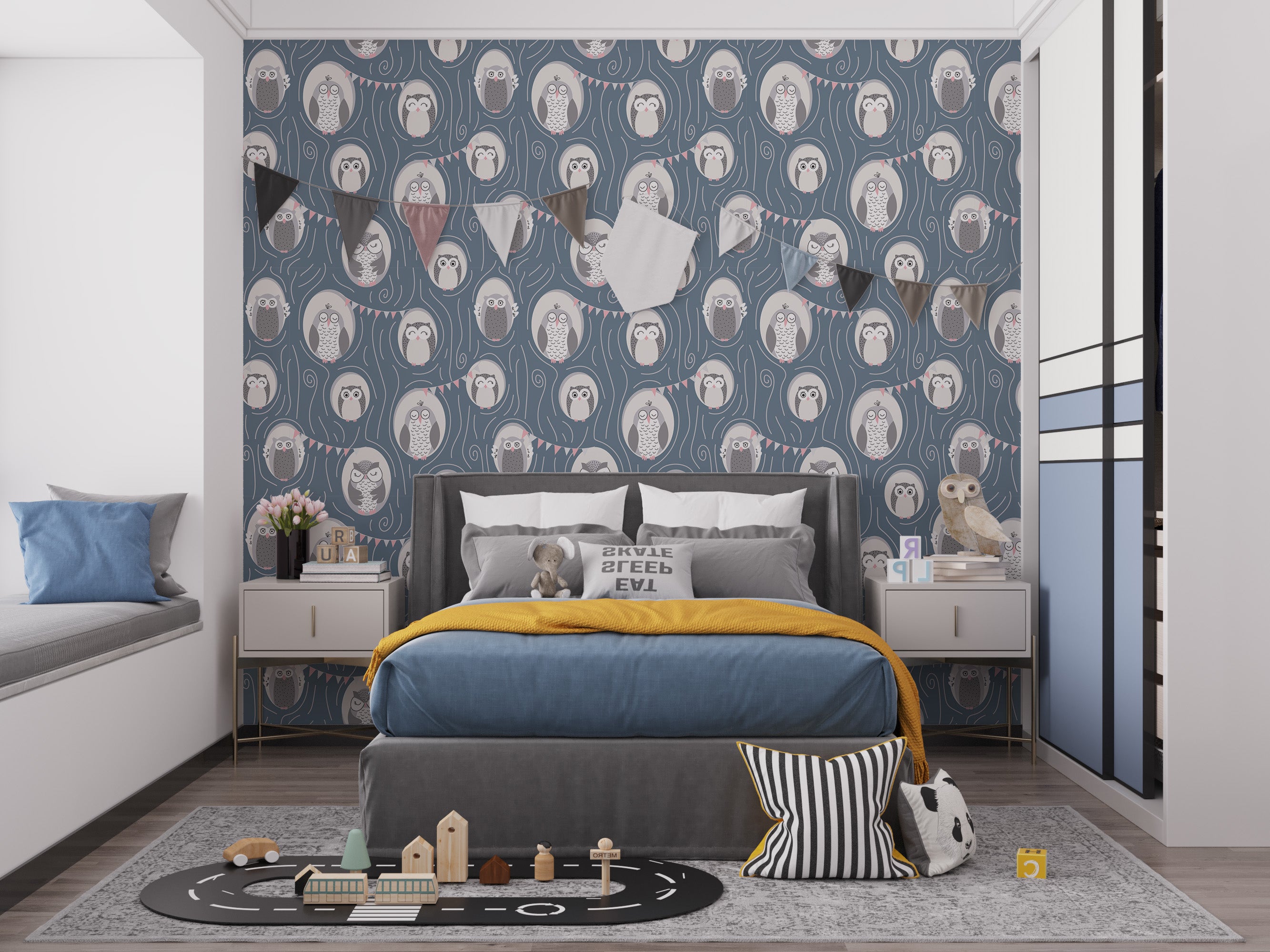 The cosy owl nook kids repeat pattern mural wallpaper is a charming addition to any child's room, offering a delightful pattern brimming with friendly owls. Each owl, with its wide eyes and soft feathers, nestles comfortably within the nooks of stylized trees, creating a scene of peaceful woodland camaraderie. The soothing colour palette provides a gentle visual backdrop, encouraging a warm and inviting atmosphere for play, learning, and rest. This whimsical kids wallpaper is designed to captivate and inspire young minds, fostering a sense of wonder and an appreciation for the enchanting creatures of the forest. It's a perfect setting for nurturing the imagination and creating a cosy, playful retreat for kids.