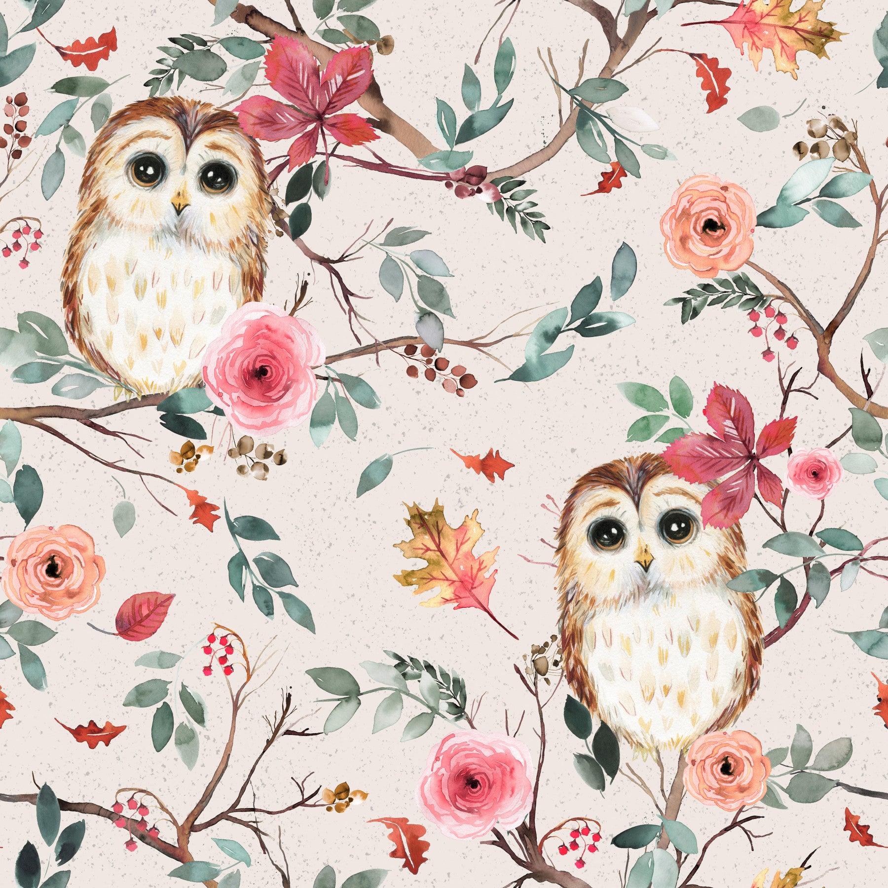 Embrace tranquility with this enchanting wallpaper featuring two adorable owls nestled amongst a vibrant autumnal scene. Delicate watercolor roses in soft pinks and peaches bloom alongside lush green leaves and rich red foliage, creating a harmonious blend of colors. The owls, rendered with exquisite detail, appear serenely perched on branches, exuding a sense of calm and peaceful coexistence with nature. This design offers a soothing escape, perfect for creating a relaxing atmosphere in any digital space. The subtle beige background enhances the overall serene and inviting mood.