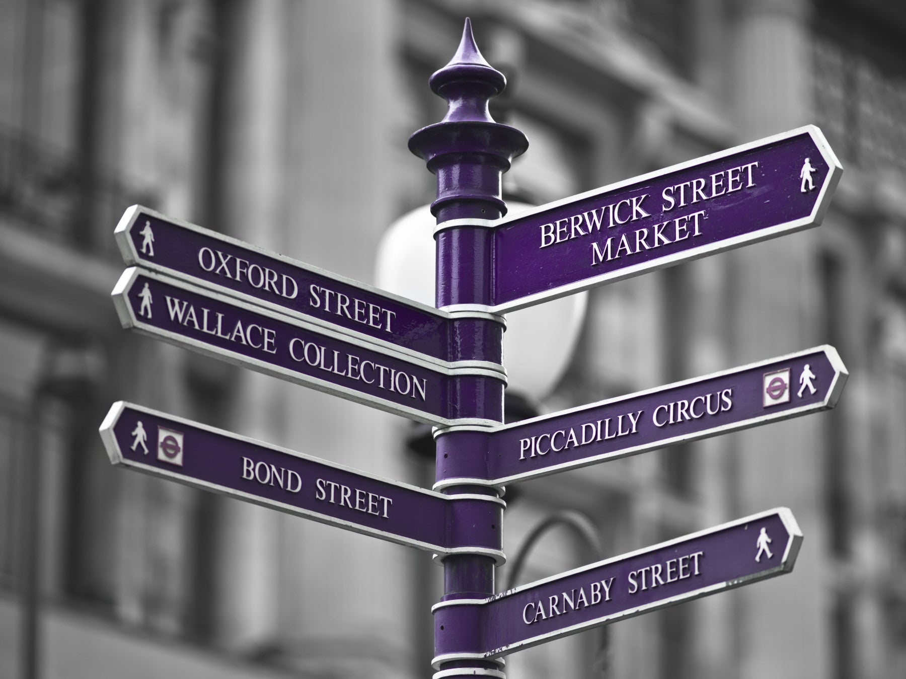 A stylish wallpaper featuring purple signboards pointing toward London favorites like Carnaby Street and Bond Street.