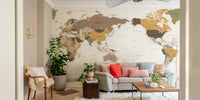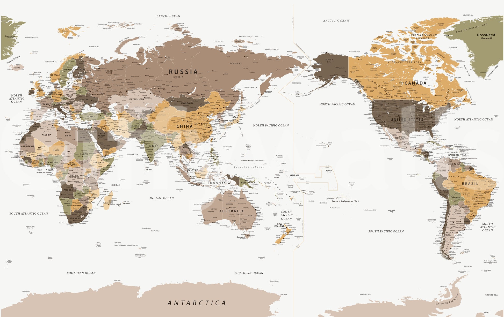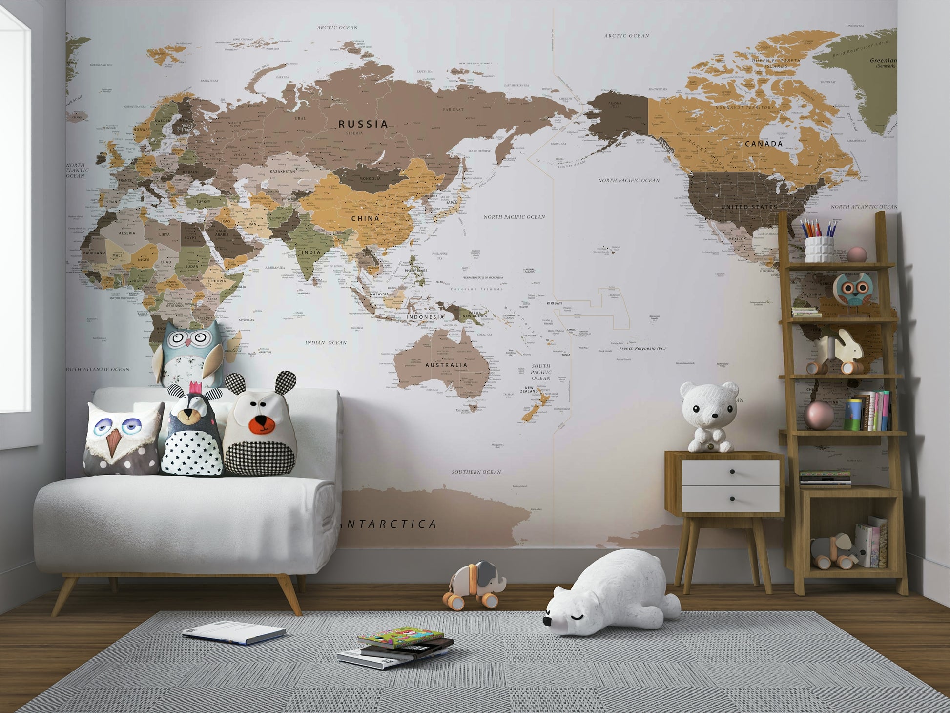 Embark on a visual journey with this stunning Pacific-centered world map wallpaper. Rich earth tones highlight continents in a captivating vintage style, drawing your eye to the vast expanse of the Pacific Ocean. Detailed country borders and city markers invite exploration, fostering a sense of wanderlust and global adventure. This meticulously crafted map offers a unique perspective, perfect for travel enthusiasts and anyone who appreciates beautiful, informative design. The calming color palette creates a serene atmosphere, making it an ideal addition to any workspace or home office.