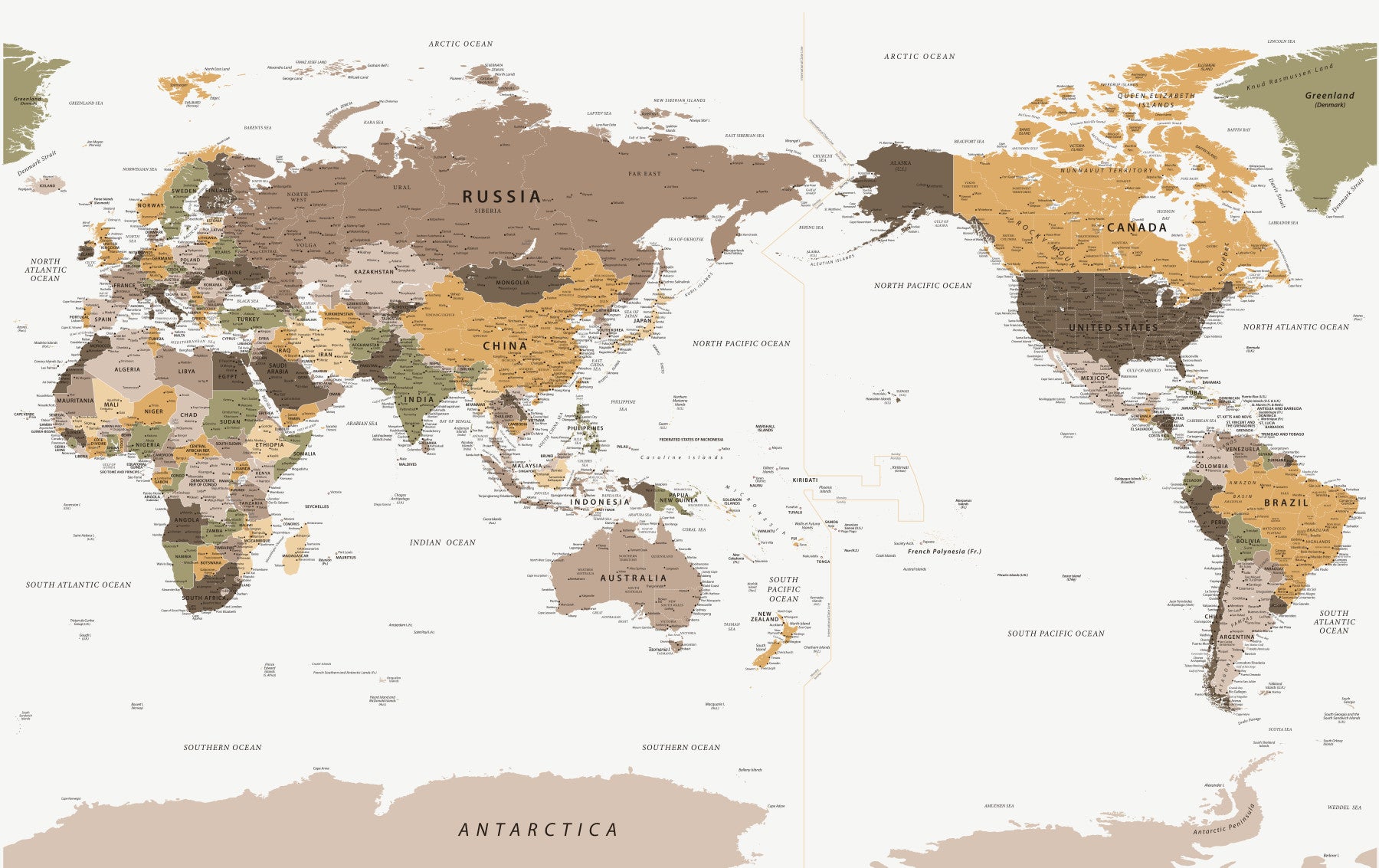 Embark on a visual journey with this stunning Pacific-centered world map wallpaper. Rich earth tones highlight continents in a captivating vintage style, drawing your eye to the vast expanse of the Pacific Ocean. Detailed country borders and city markers invite exploration, fostering a sense of wanderlust and global adventure. This meticulously crafted map offers a unique perspective, perfect for travel enthusiasts and anyone who appreciates beautiful, informative design. The calming color palette creates a serene atmosphere, making it an ideal addition to any workspace or home office.