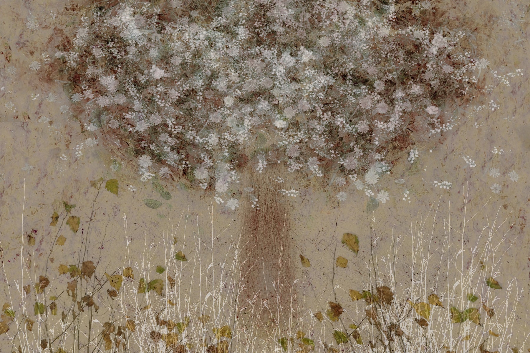 Bring botanical grace to your interior with this artistic blossom print. White floral clusters bloom atop an earthy toned background. Fine details in the stem and lower grasses add visual intrigue. This wallpaper for walls brings the outdoors in, suitable for a bedroom, bathroom or reading nook. The muted color palette blends smoothly into modern, minimalist, or even traditional homes. A soothing and elegant way to style your walls.