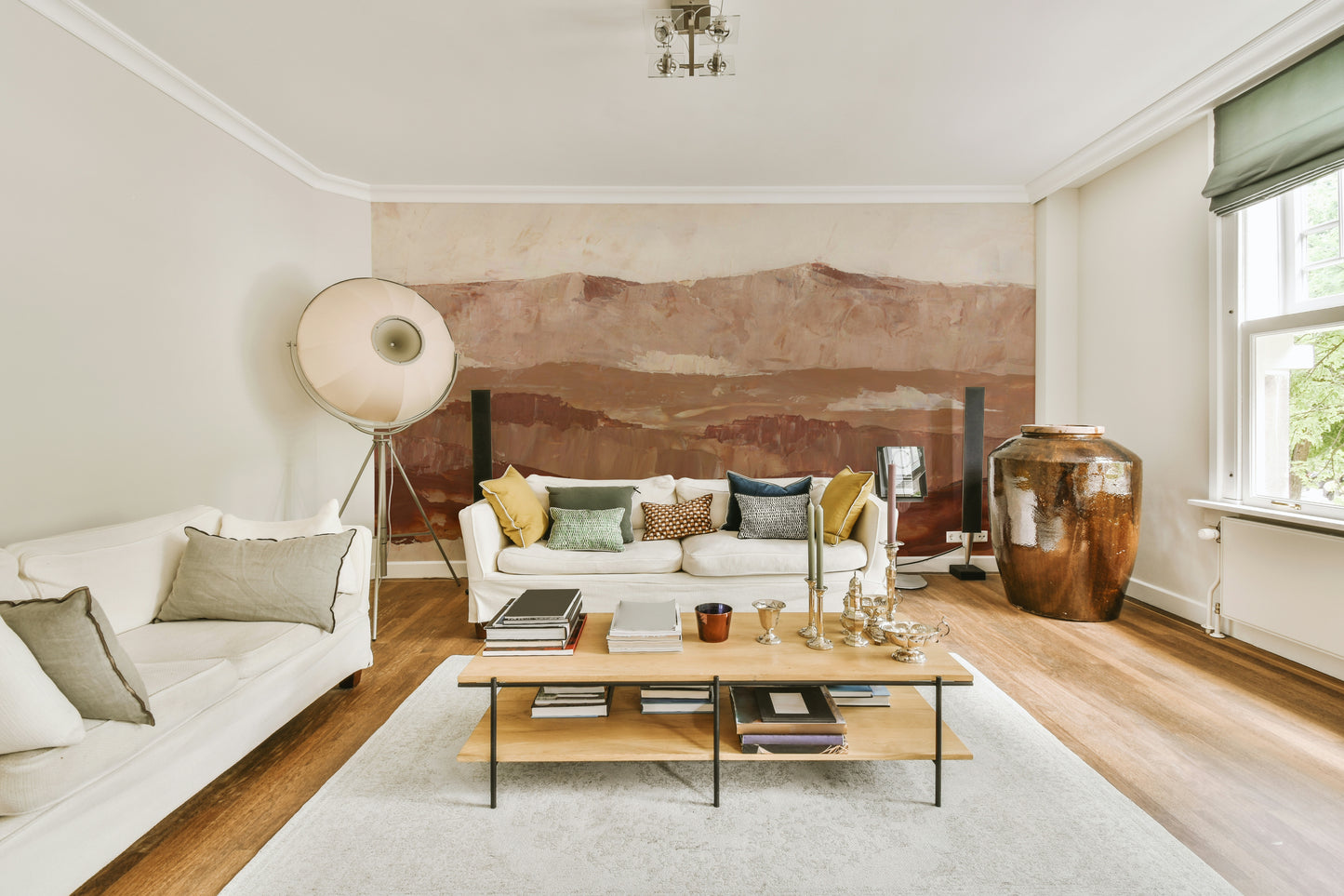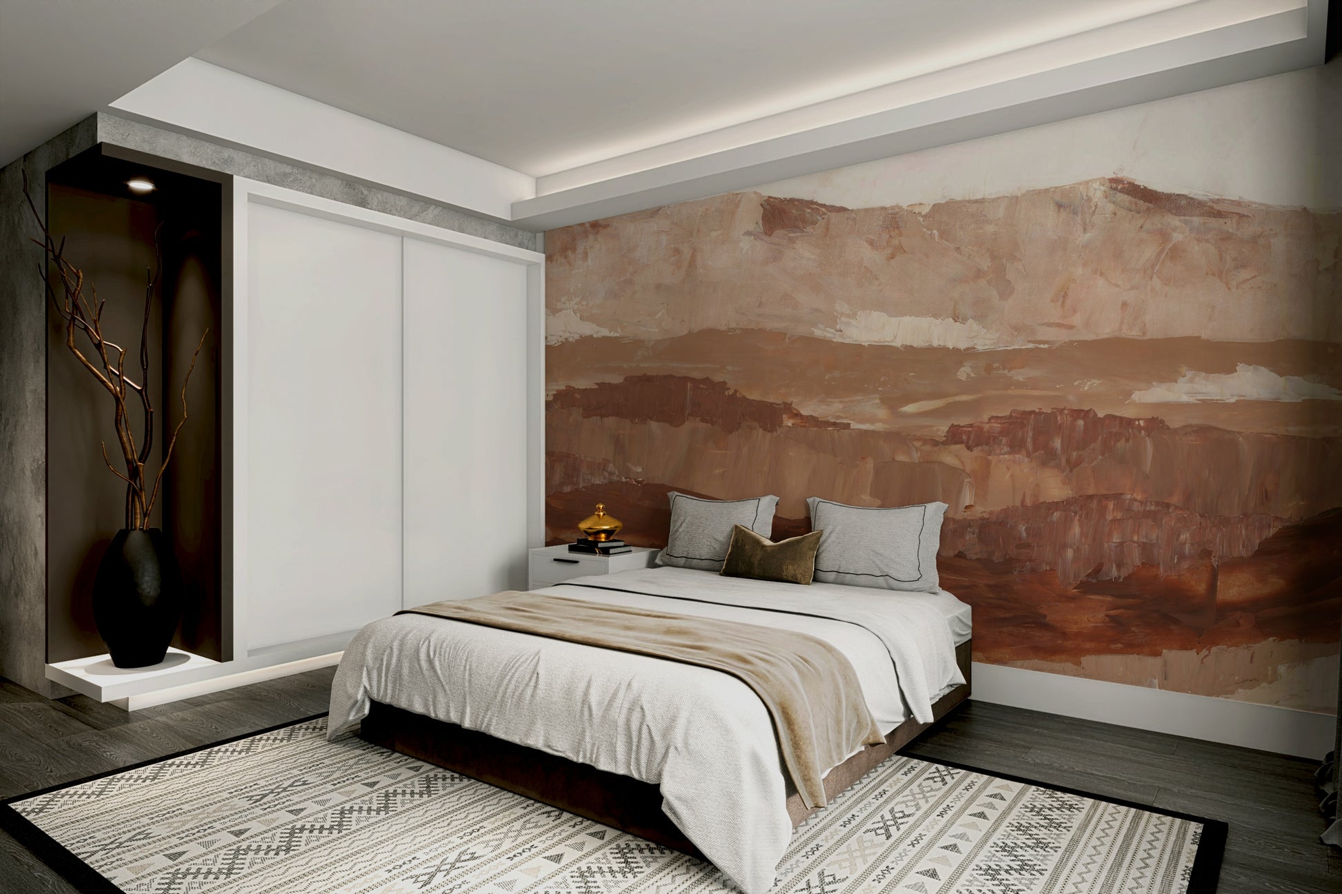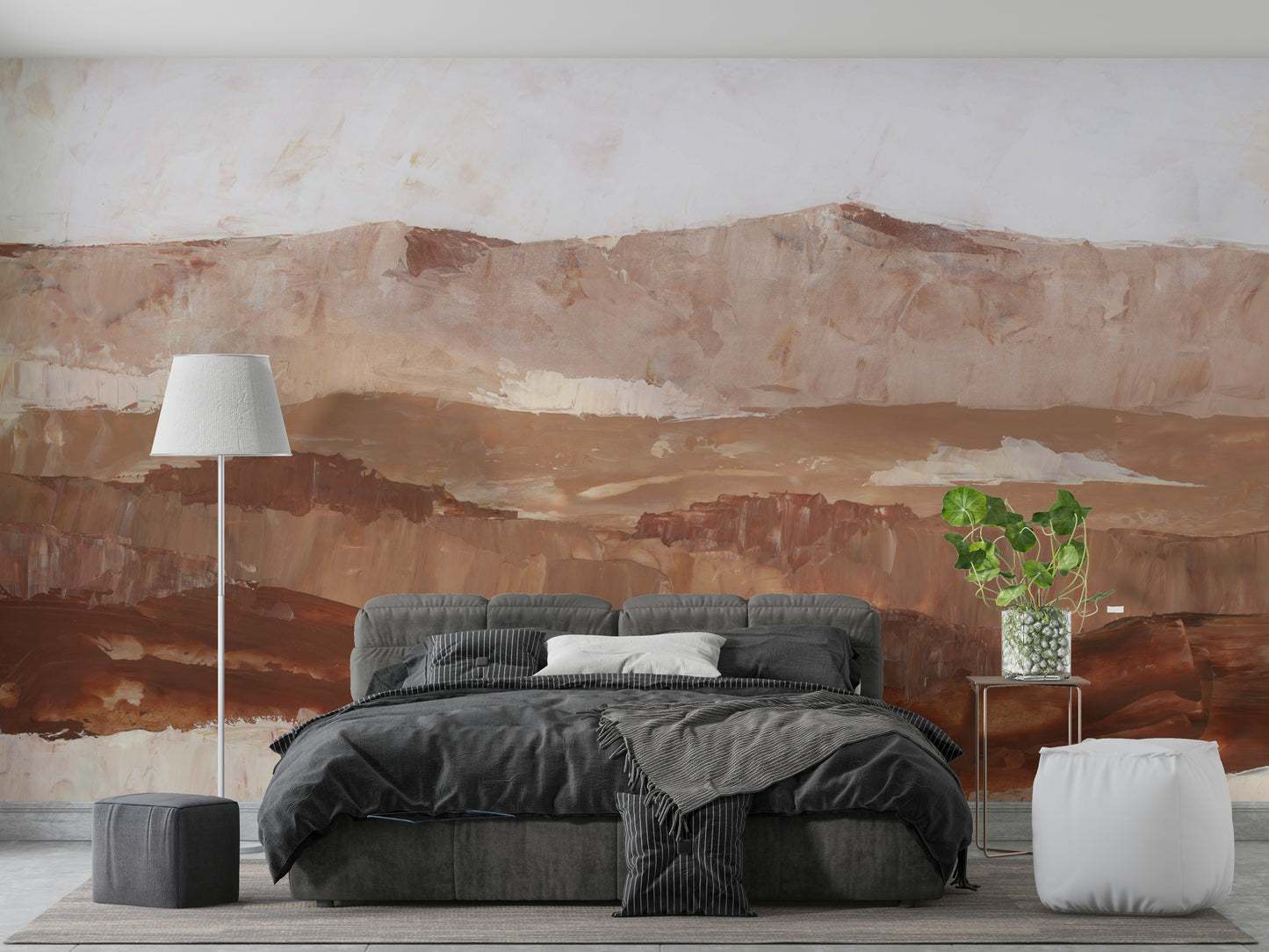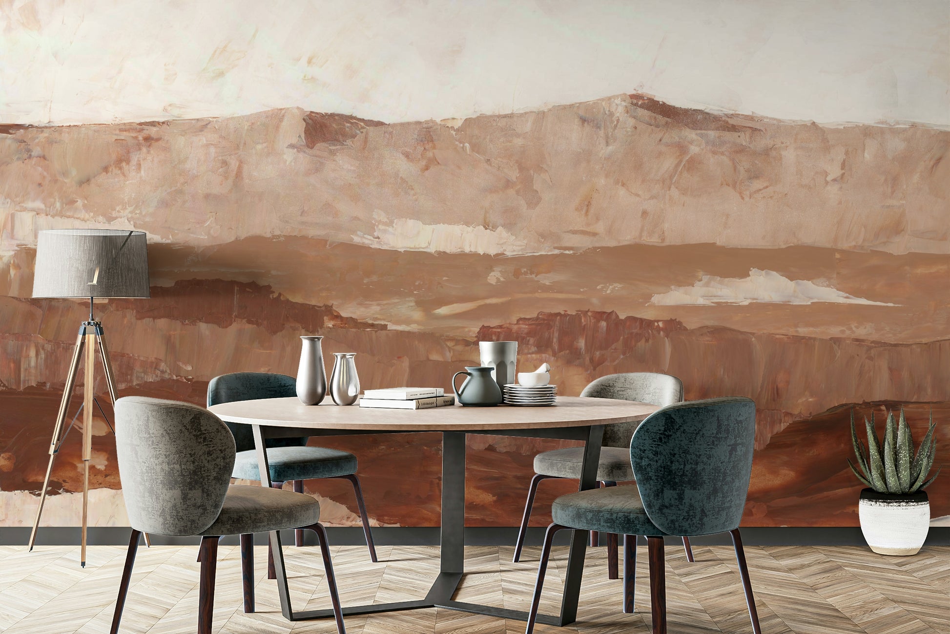 Hand-painted peaks mural in gentle earthy tones