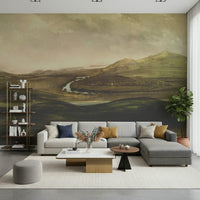 Transform rooms with this scenic landscape. It showcases rolling hills and a serene river, created with expressive brushstrokes in earthy hues. The wallpaper for walls presents a calming ambiance, ideal for a living room, bedroom, or office. The soft tones and vista design offer a touch of nature, creating visual depth and expanding the feel of any space. It promotes a relaxed vibe in minimalist or traditional decors.