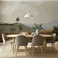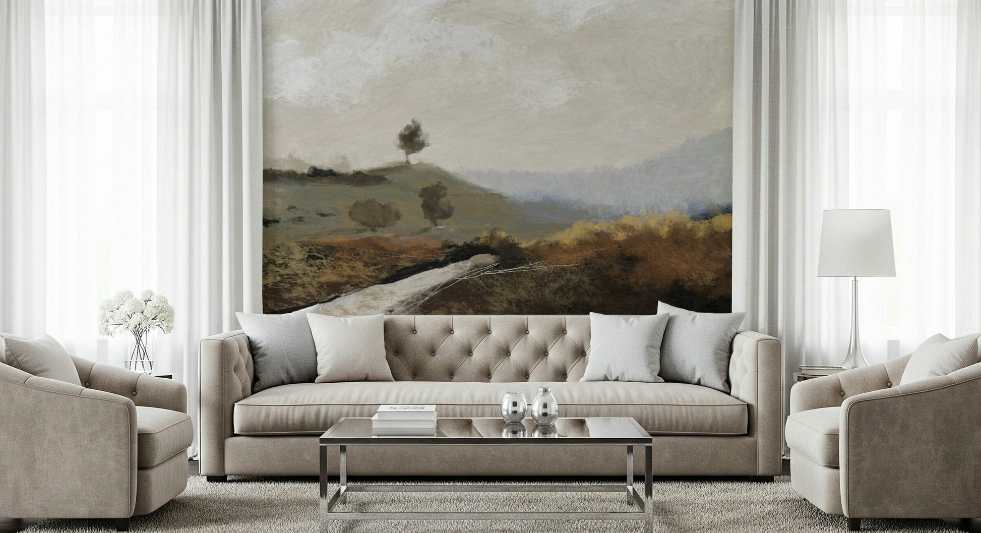 Experience the serenity of a hand-painted landscape. This wallpaper for walls captures a tranquil vista with soft brushstrokes and a muted colour palette. Hues of beige, brown, and blue blend to create a calming atmosphere. The design evokes a sense of peace. This versatile design suits bedrooms, living rooms, or offices, creating a relaxing backdrop and complements minimalist or rustic interiors.