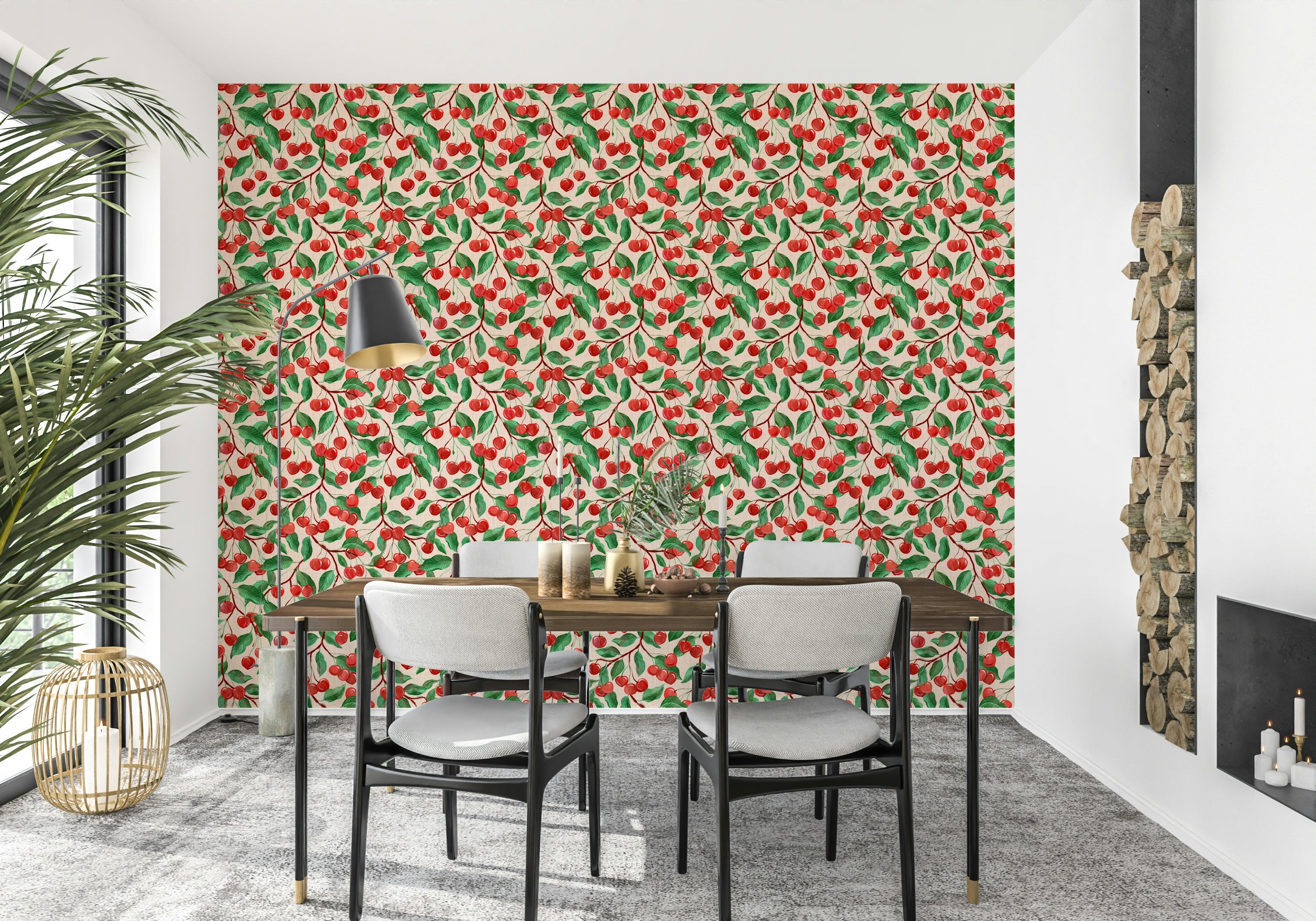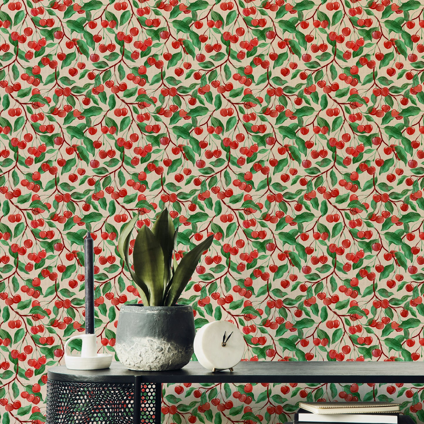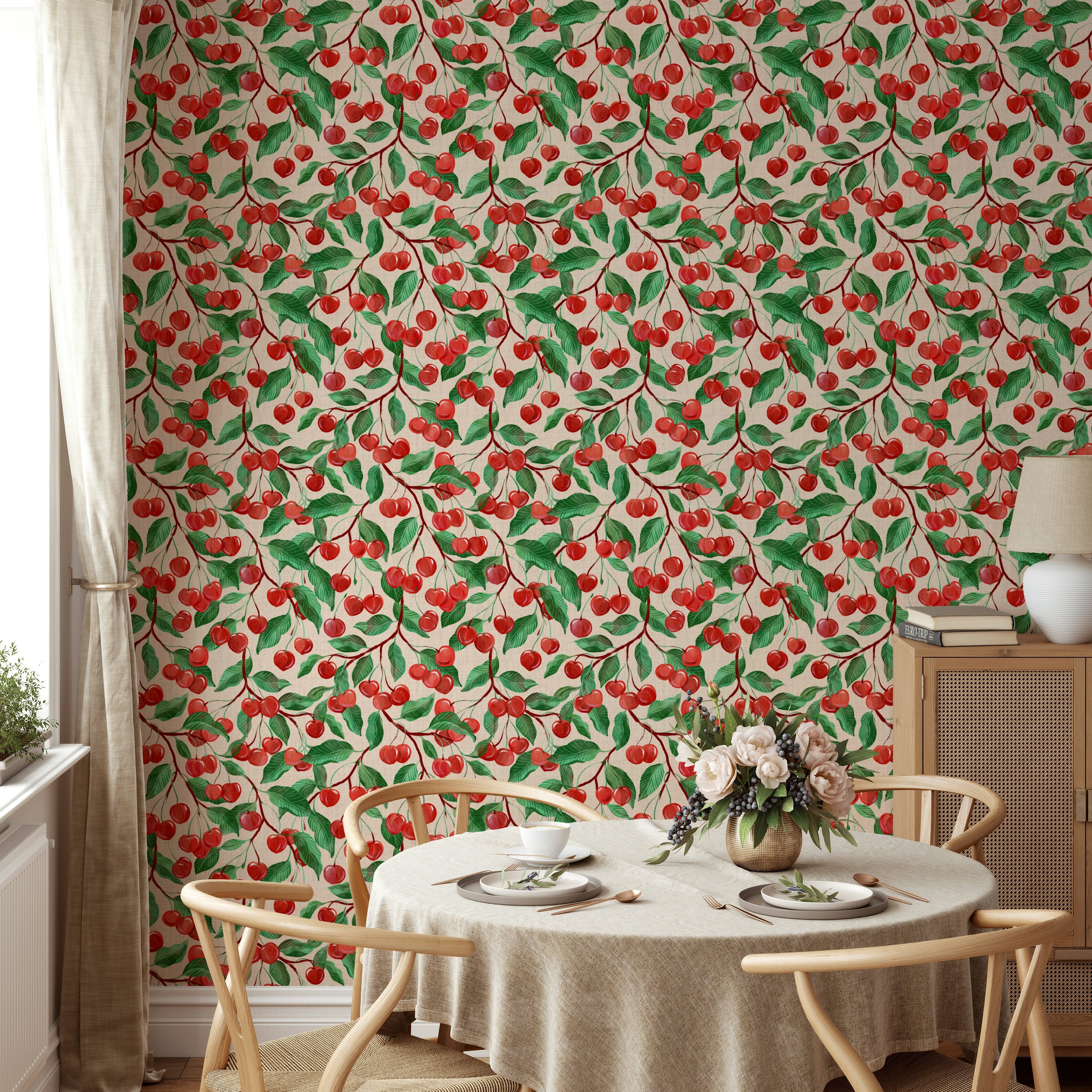 Indulge in the vibrant beauty of 'Painterly Cherries,' a digital wallpaper that captures the essence of summer. Luscious, crimson cherries, rendered in a painterly style with visible brushstrokes, hang from lush, green branches against a soft, beige linen-textured backdrop. The design is both playful and sophisticated, creating a cheerful and inviting atmosphere. The watercolor-like effect adds a touch of whimsy, making this wallpaper perfect for adding a touch of fruity charm to any digital device. Enjoy the delectable visual feast!