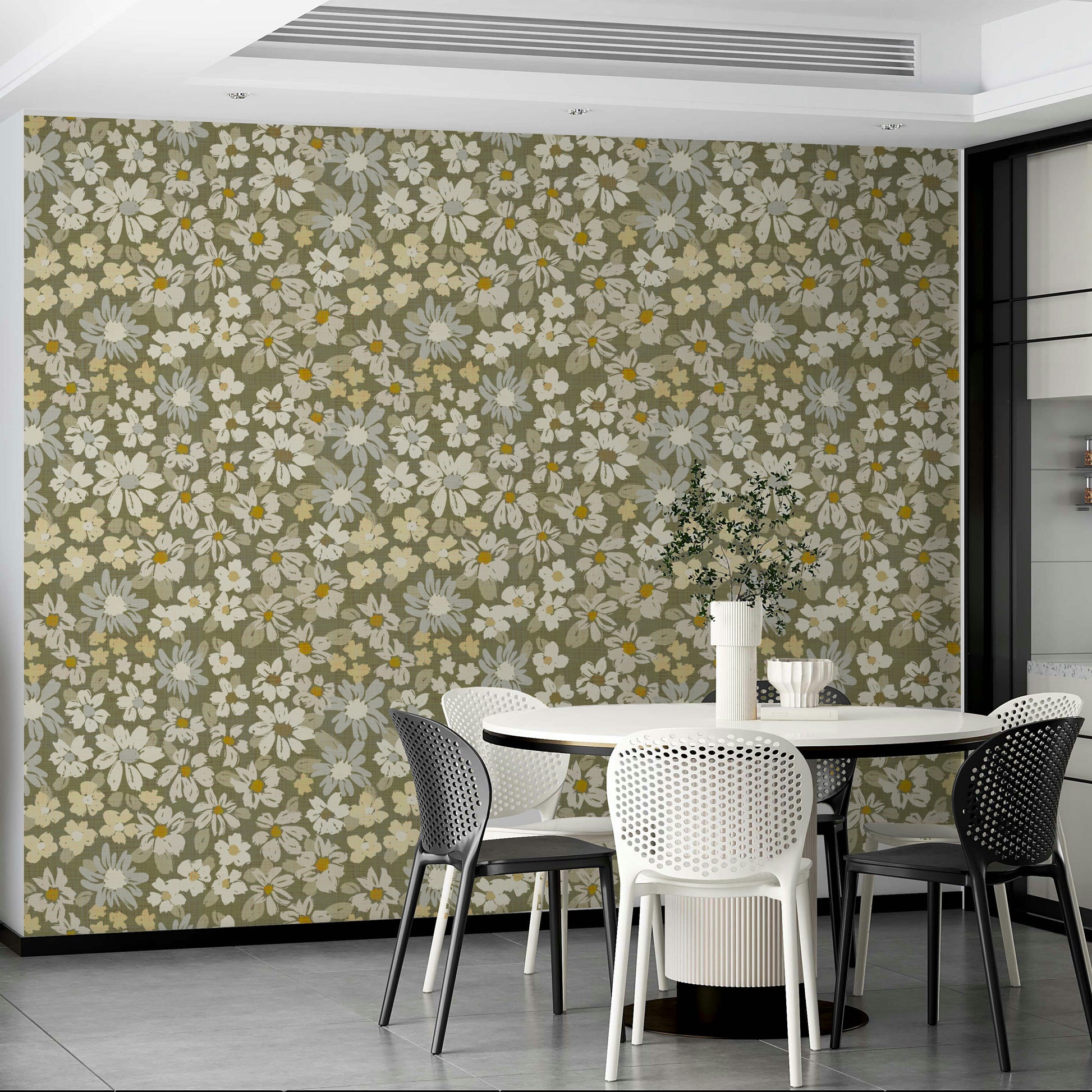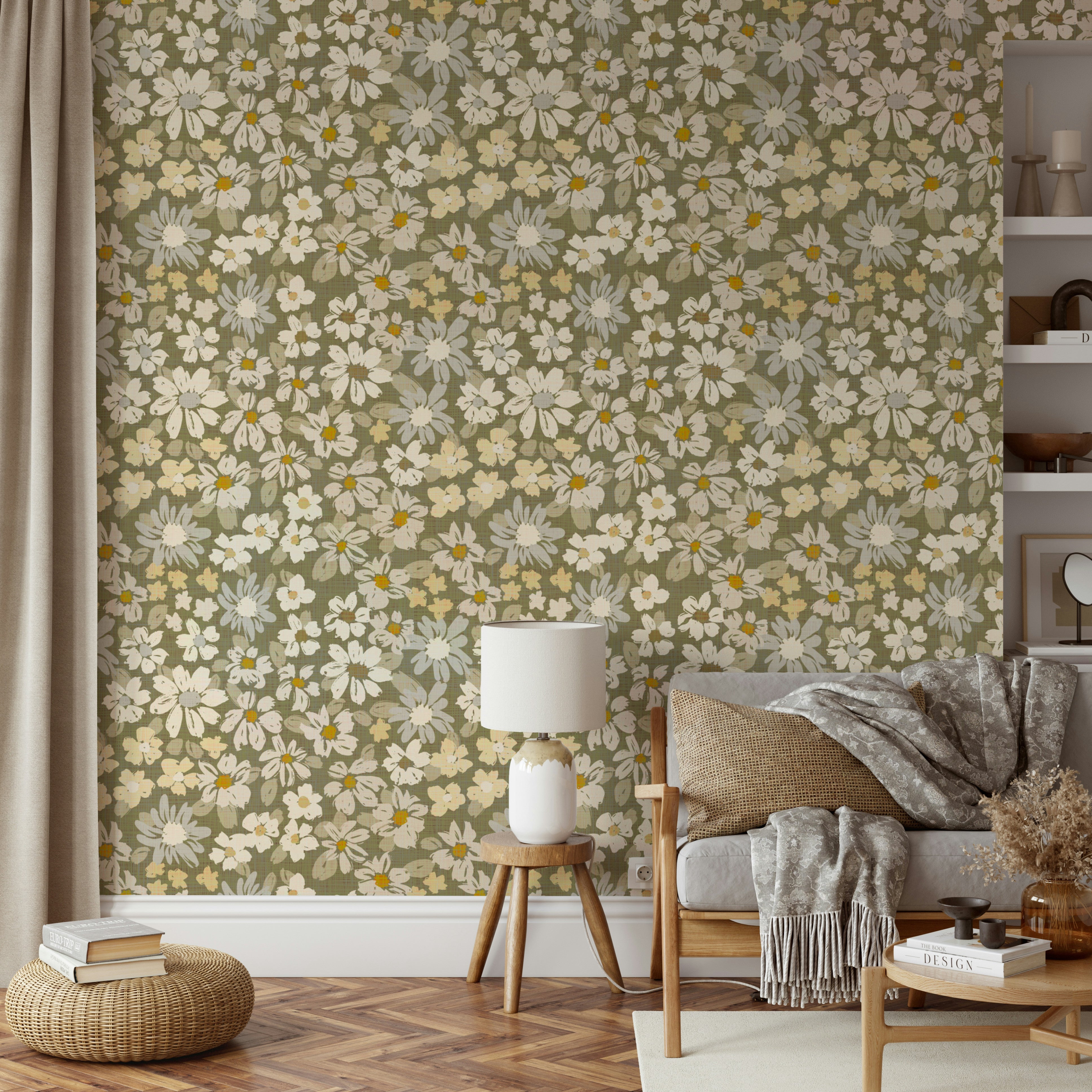 Adorn your home with the artistic charm of our Painterly Cottage Chic Spring Florals Wallpaper. This delightful mural wallpaper features a captivating floral design, rendered with a beautiful, hand-painted effect, perfect for cultivating a cozy, romantic, and inviting farmhouse aesthetic. The flowers are depicted in various shades of creamy white, soft pale yellow, and muted light blue-grey, set against a serene and earthy sage green background with subtle textural details. It's an ideal wallpaper for walls to introduce unique character and serene beauty to any room. Its soft, expressive brushstrokes and charming color palette offer a captivating backdrop, ensuring your home feels both artistic and beautifully connected to the fresh charm of a spring garden. This art piece is an ideal choice for a harmonious and uplifting home.