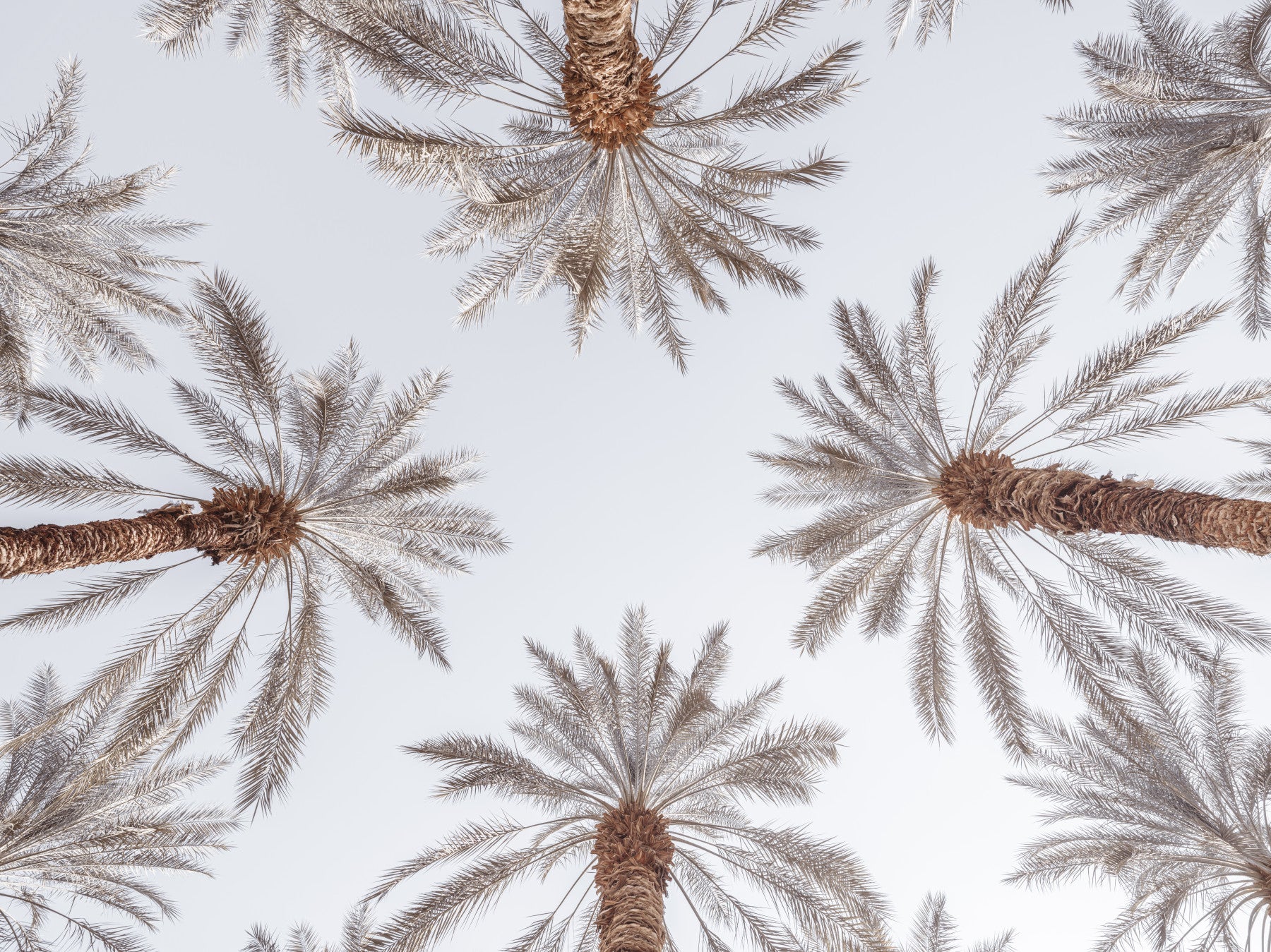 A wall mural of a view looking up at palm trees.