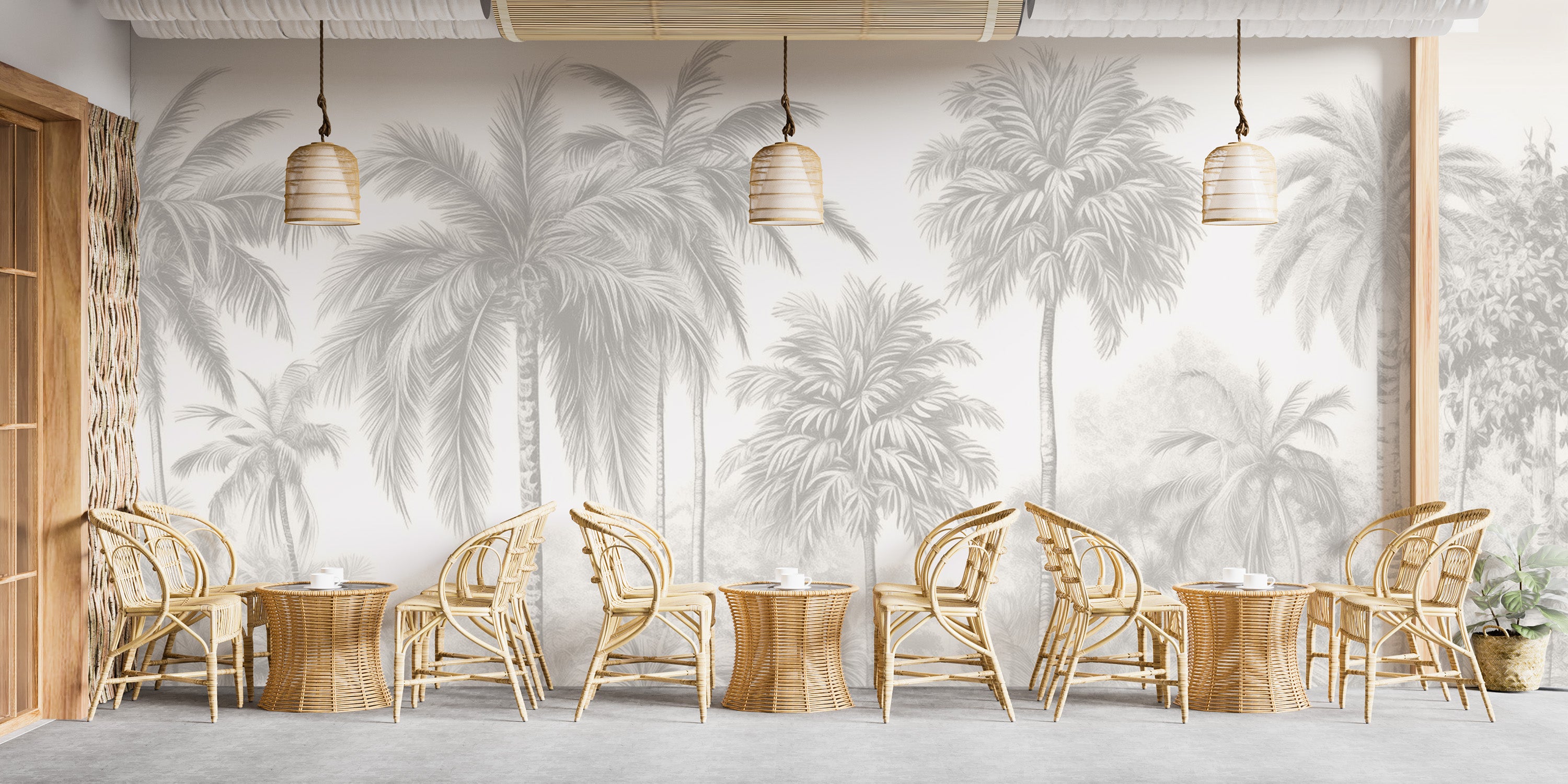 Embrace a tropical paradise using this palm tree wallpaper mural. Tall, slender tropical trees sway gently in a subtle breeze. Soft, muted tones create a calming backdrop, perfect for creating a serene environment. Ideal for various spaces, this mural's design adds a touch of nature. High-quality print ensures clarity and vibrancy, making the palm trees appear lifelike and inviting. Bring the outdoors inside by incorporating this elegant mural into your interior design. Let the peaceful vibe of palm trees enhance the atmosphere. Refresh your walls using this beautiful and serene palm tree wallpaper mural, creating a soothing and stylish setting.