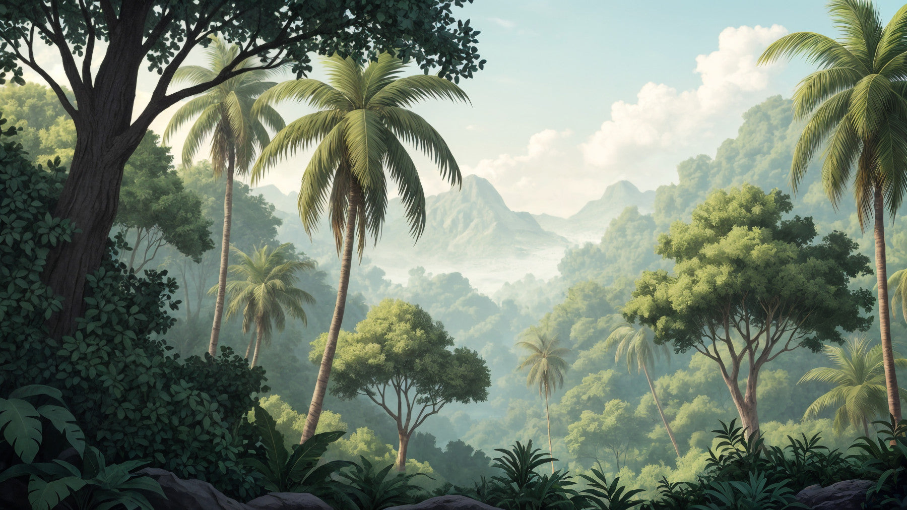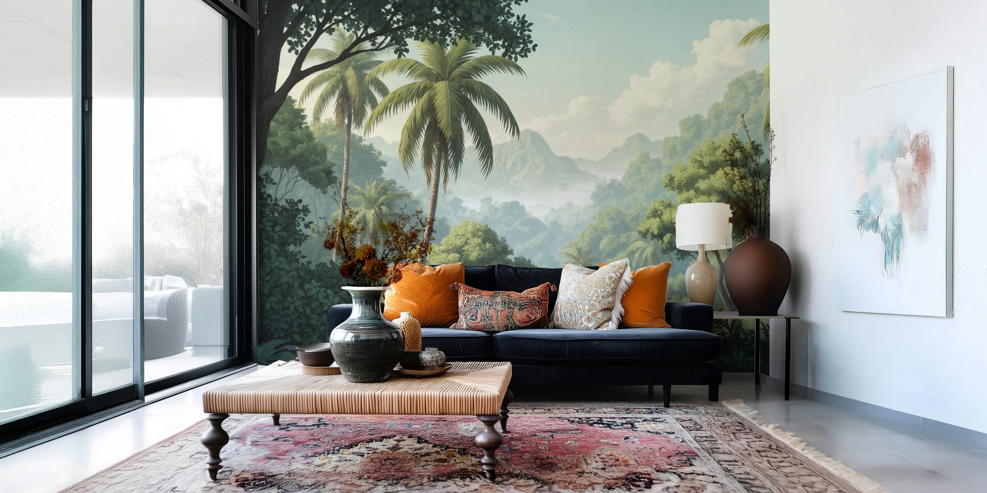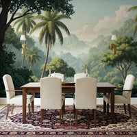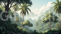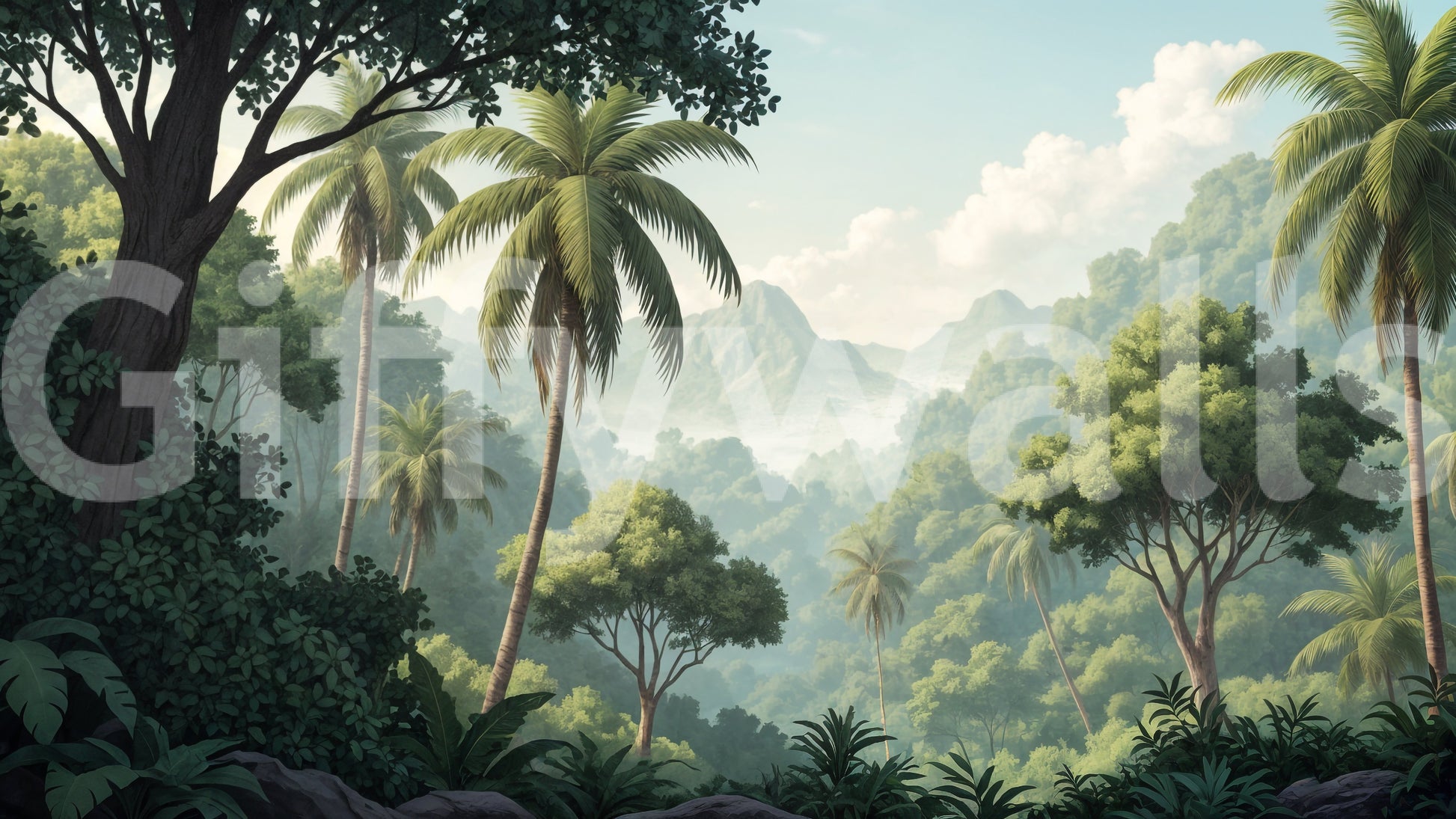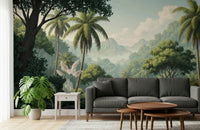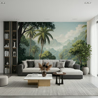 Invite the beauty of a tranquil forest into your home with this scenic wallpaper for walls. The design showcases lush palm trees overlooking distant mountains, all rendered in soothing greens and blues. This tranquil scene brings an element of peace to any room, making it a great addition to a bedroom, living room, or even a home office. Use this wallpaper to enhance the natural light in your space and create a serene retreat. The blend of tropical ambiance and a cool palette will rejuvenate your decor, ensuring a space that feels fresh and inviting.