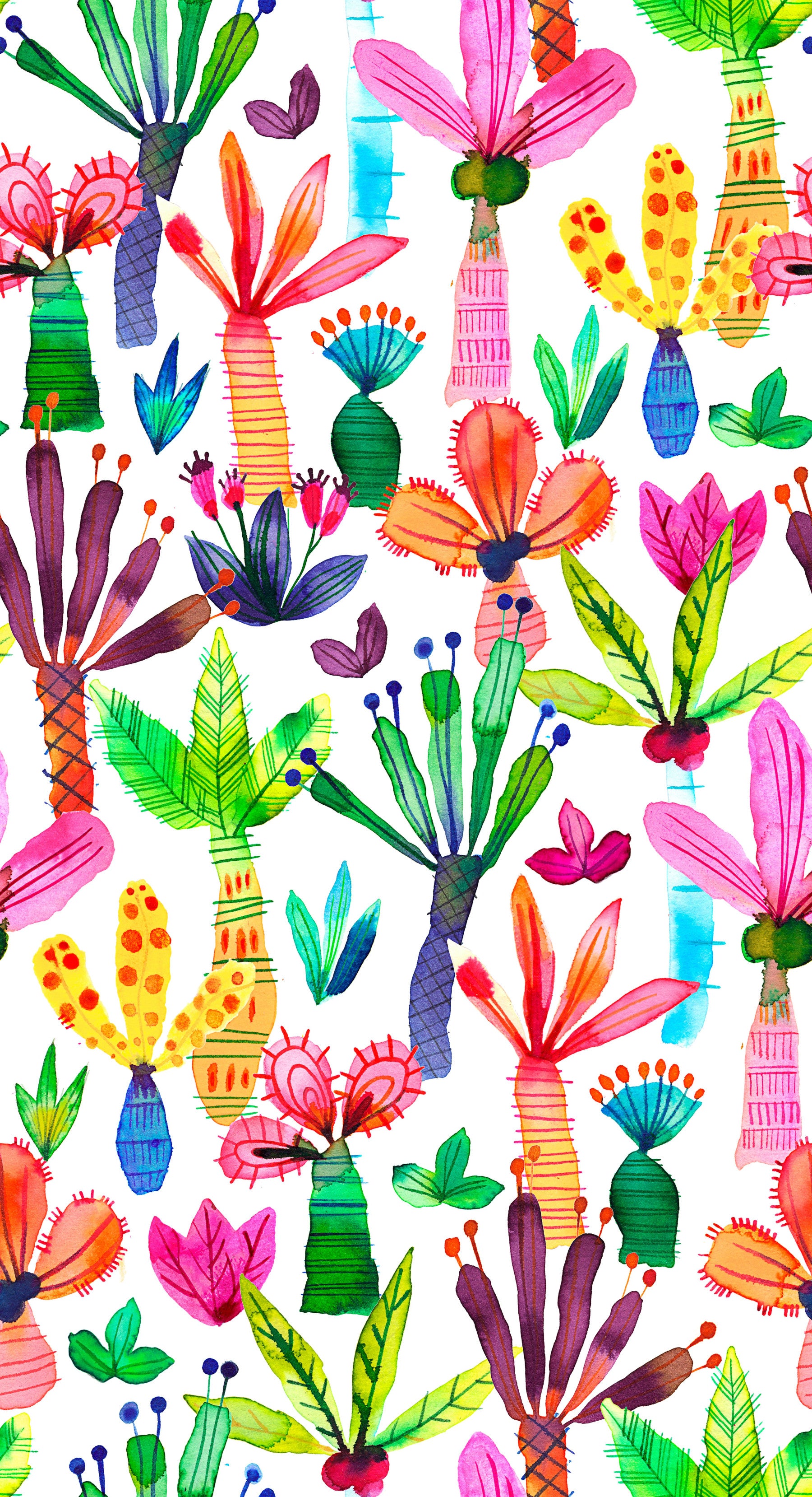 Dive into a vibrant world of playful botanicals with "Palms Garden Colorful Kids." This wallpaper bursts with joy, showcasing a whimsical array of stylized palm trees and flowers in a dazzling spectrum of colors. The hand-painted watercolor style lends a charming, childlike innocence to the design, making it perfect for nurseries, playrooms, or any space needing a boost of cheerful energy. Each element, from the bright, textured trunks to the uniquely shaped blooms, adds to the overall whimsical and energetic mood. A white background allows the colorful flora to truly shine, creating a lively and captivating scene that's both fun and imaginative.