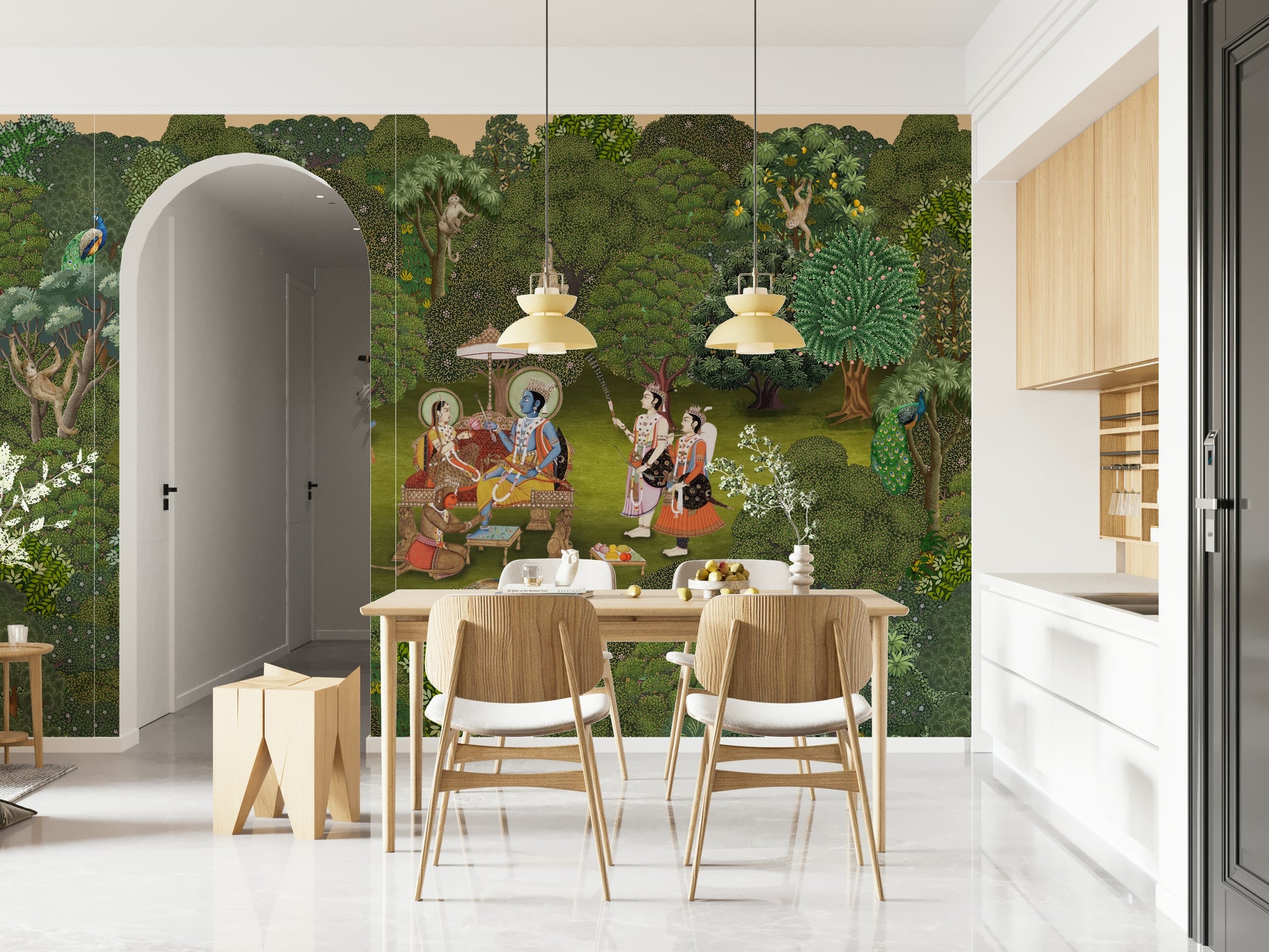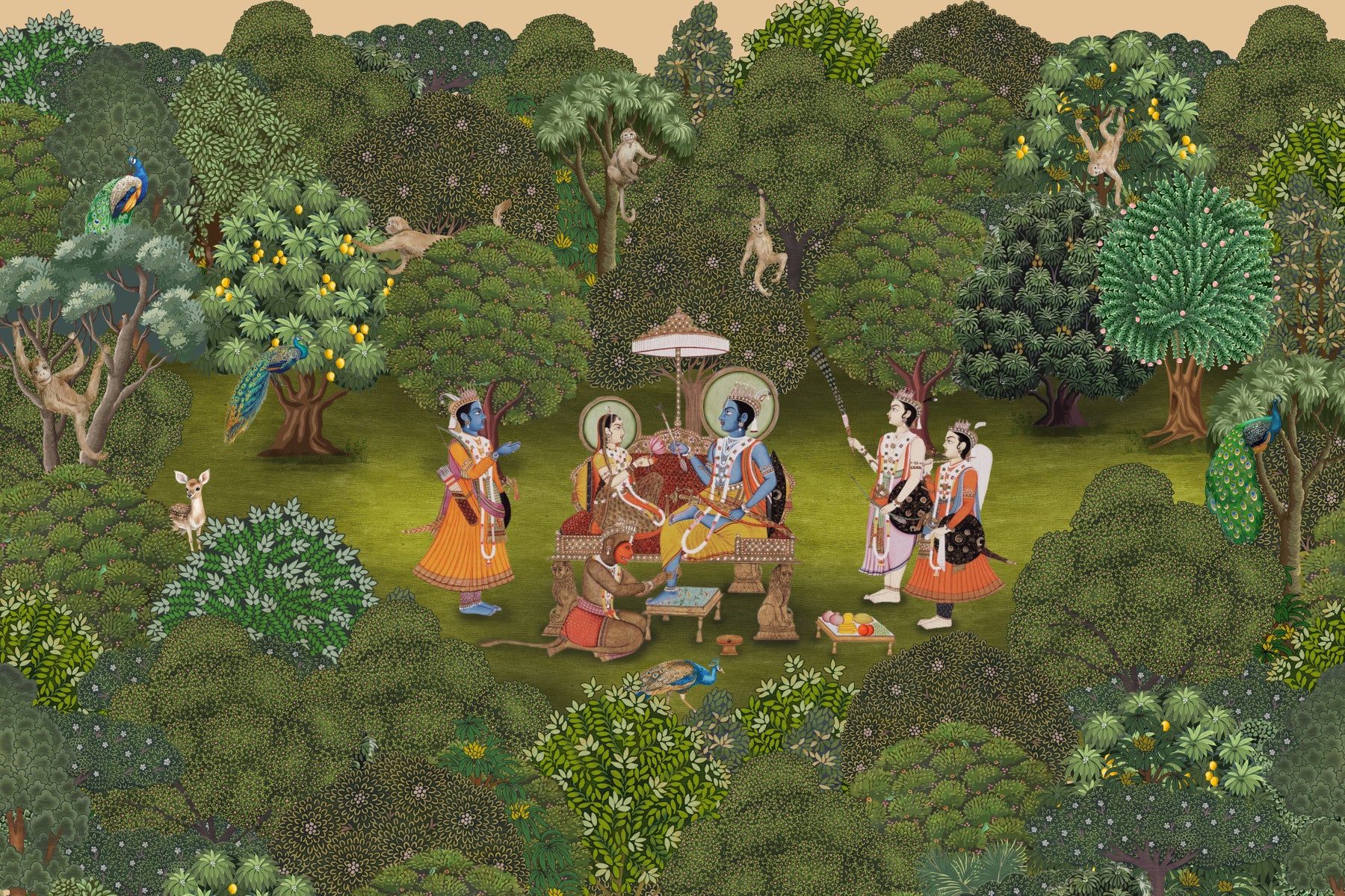 Immerse yourself in the serene beauty of 'Panchavati Vihar', a meticulously crafted wall décor piece inspired by traditional Indian art. This vibrant artwork transports you to a lush, enchanted forest. Ram and Sita, the divine couple, are depicted in peaceful repose amidst a thriving natural world, surrounded by courtiers and attendants. Towering trees filled with vibrant leaves and ripe fruits create a dense, captivating backdrop. Peacocks strut proudly, monkeys playfully swing through the branches, and a gentle deer graces the forest floor. The intricate details and rich colour palette bring a touch of timeless elegance and spiritual harmony to any room, transforming your space into a tranquil sanctuary. Let this idyllic scene infuse your home with the essence of tranquility and regal charm.