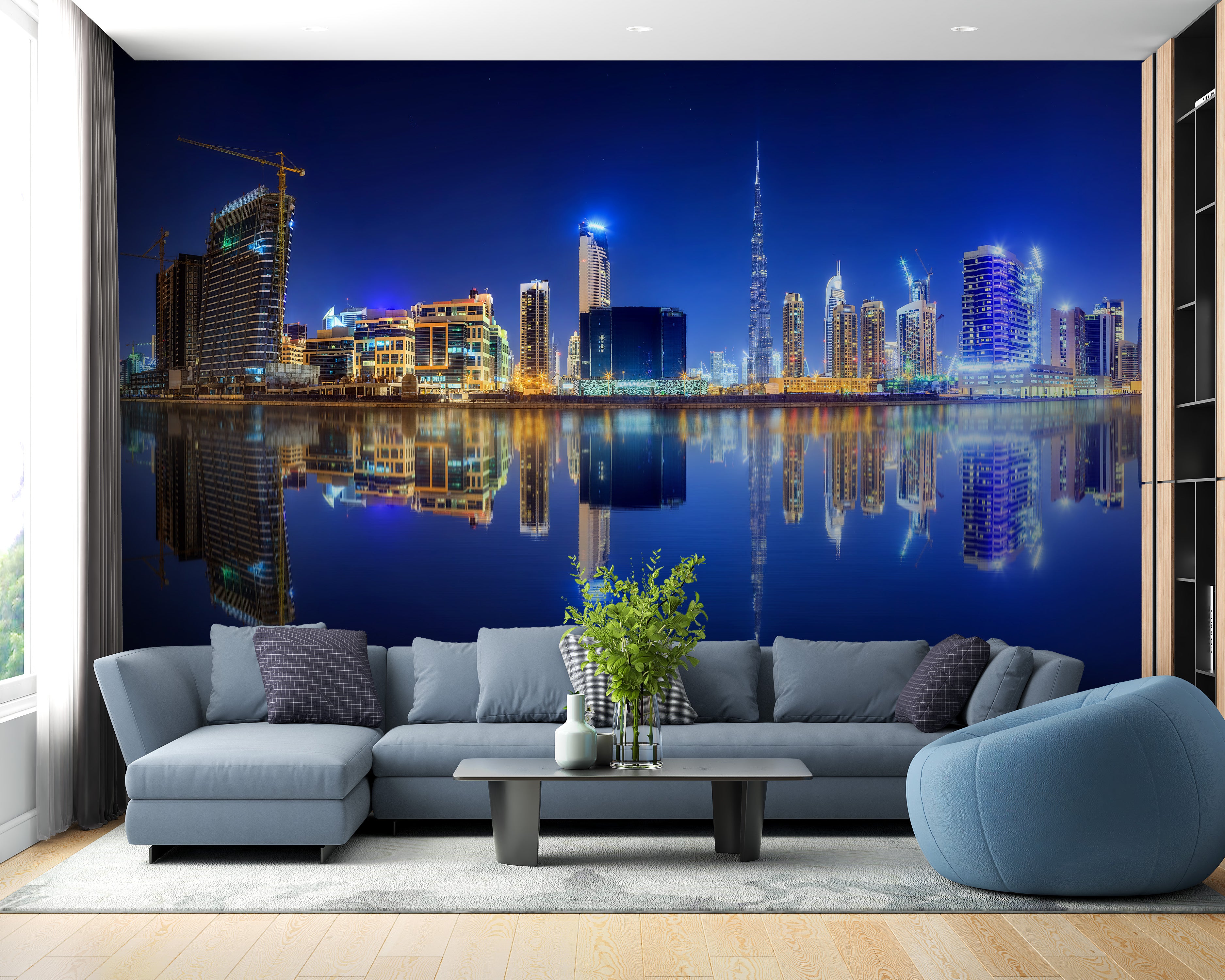 This panoramic mural wallpaper captures the mesmerizing essence of Dubai at night, presenting a breathtaking cityscape perfect for an office setting. The vibrant, high-resolution image showcases Dubai's iconic skyline, with its dazzling array of lights reflecting off the serene waters. Ideal as an office and city wallpaper, this mural brings a sense of dynamic energy and sophistication to any workspace. The stunning visuals provide a backdrop that enhances focus and inspiration, subtly elevating the room's mood. The intricate details of the skyscrapers and the vivid play of light and shadow offer a captivating view, making it an excellent choice for those seeking to add a touch of urban elegance to their professional environment. This wallpaper is not just a decorative piece but a conversation starter, blending the allure of urban life with artistic flair.