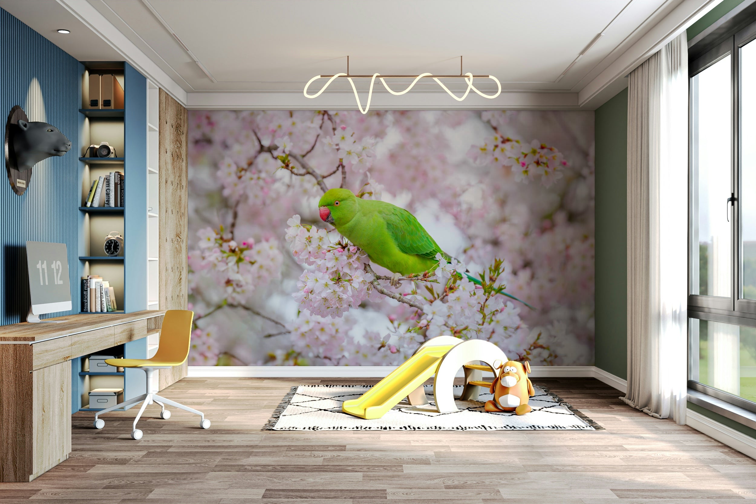 The Parakeets Among Flowers Wall Mural captures a lively moment of nature with a vibrant green parakeet perched on delicate cherry blossom branches. The contrast between the parakeet's bright feathers and the soft pink blooms creates a joyful and refreshing scene. Ideal for bedrooms, nurseries, or garden-themed spaces, this mural wallpaper adds charm, color, and the uplifting presence of springtime to your walls. It’s a cheerful visual escape to a blooming world full of gentle beauty and life.