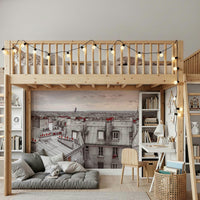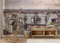 Flower vase on window with Eiffel tower in background, Paris. Transform your living spaces with this stunning Parisian cityscape wallpaper for walls. The design showcases a panoramic view of Paris from above the rooftops. Buildings and architectural details are highlighted in a muted palette with pops of red accents. The wallpaper brings a touch of European flair to any room. Ideal for living rooms, dining areas, and bedrooms. It creates an elegant focal point and complements contemporary and traditional interior designs. This wallpaper evokes a sense of sophistication and wanderlust, making any space feel larger and more open.