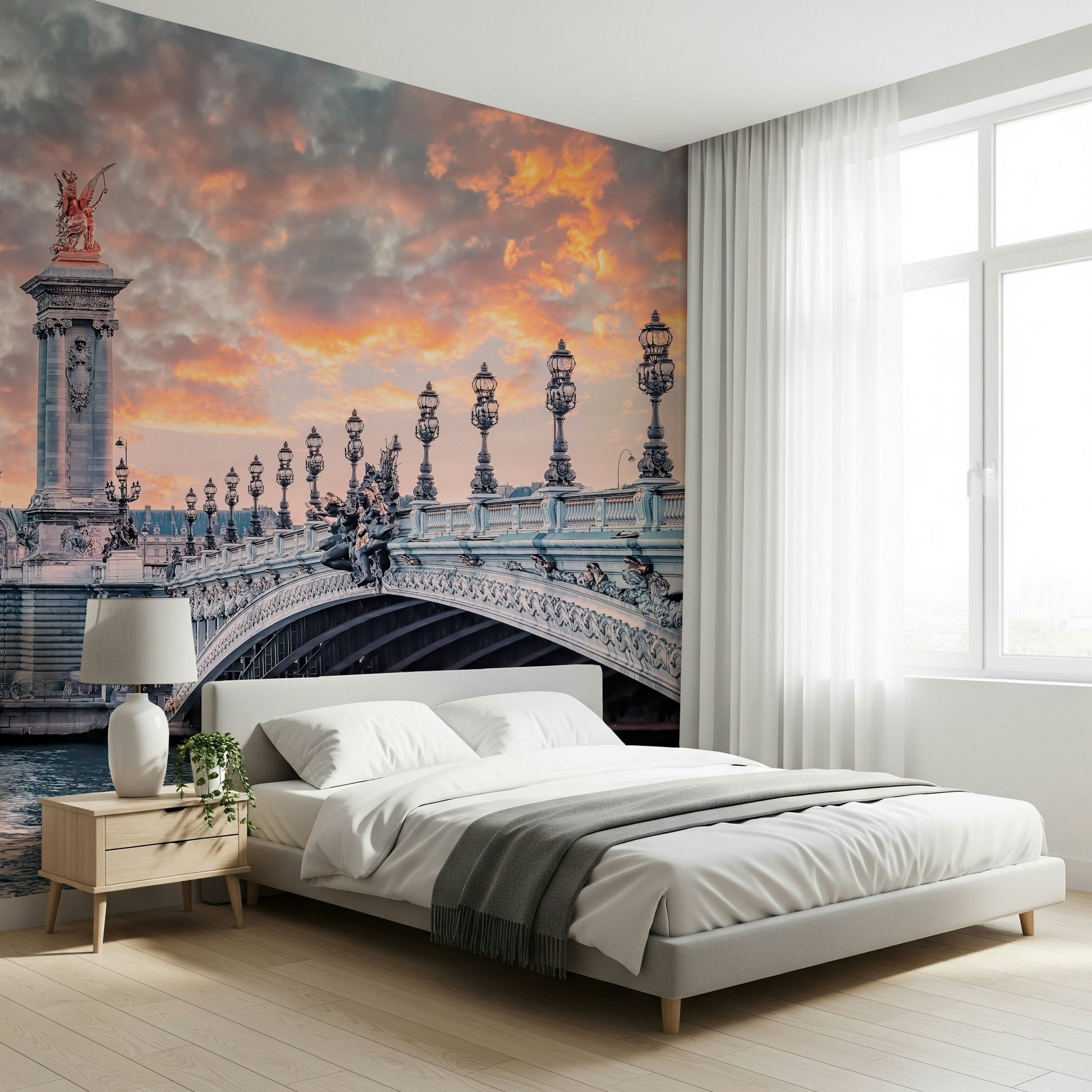 Transform your interior space with this stunning image of the Alexandre III Bridge in Paris. The wallpaper for walls captures the iconic bridge in the warm glow of a sunset. Pink and orange hues paint the dramatic sky, complementing the intricate details of the bridge's sculptures and elegant street lamps. The overall effect is a fusion of architectural grandeur and soft, romantic light. Ideal for adding a touch of Parisian elegance to your living room, bedroom, or entryway, this wallpaper creates a sophisticated and inviting ambience.