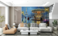 Transform your living space with this beautiful Parisian carousel wallpaper for walls. The design evokes the charm of Paris with the Eiffel Tower in the distance and a vintage carousel as the centrepiece. The vibrant lights and reflections in the wet street create a magical, dreamy atmosphere. This wallpaper uses a rich colour palette of blues, golds, purples, and reds, adding a touch of elegance to bedrooms, living rooms, and dining areas. The impressionistic style complements both modern and classic interiors, offering a sophisticated focal point. Bring the romance of Paris into your home.