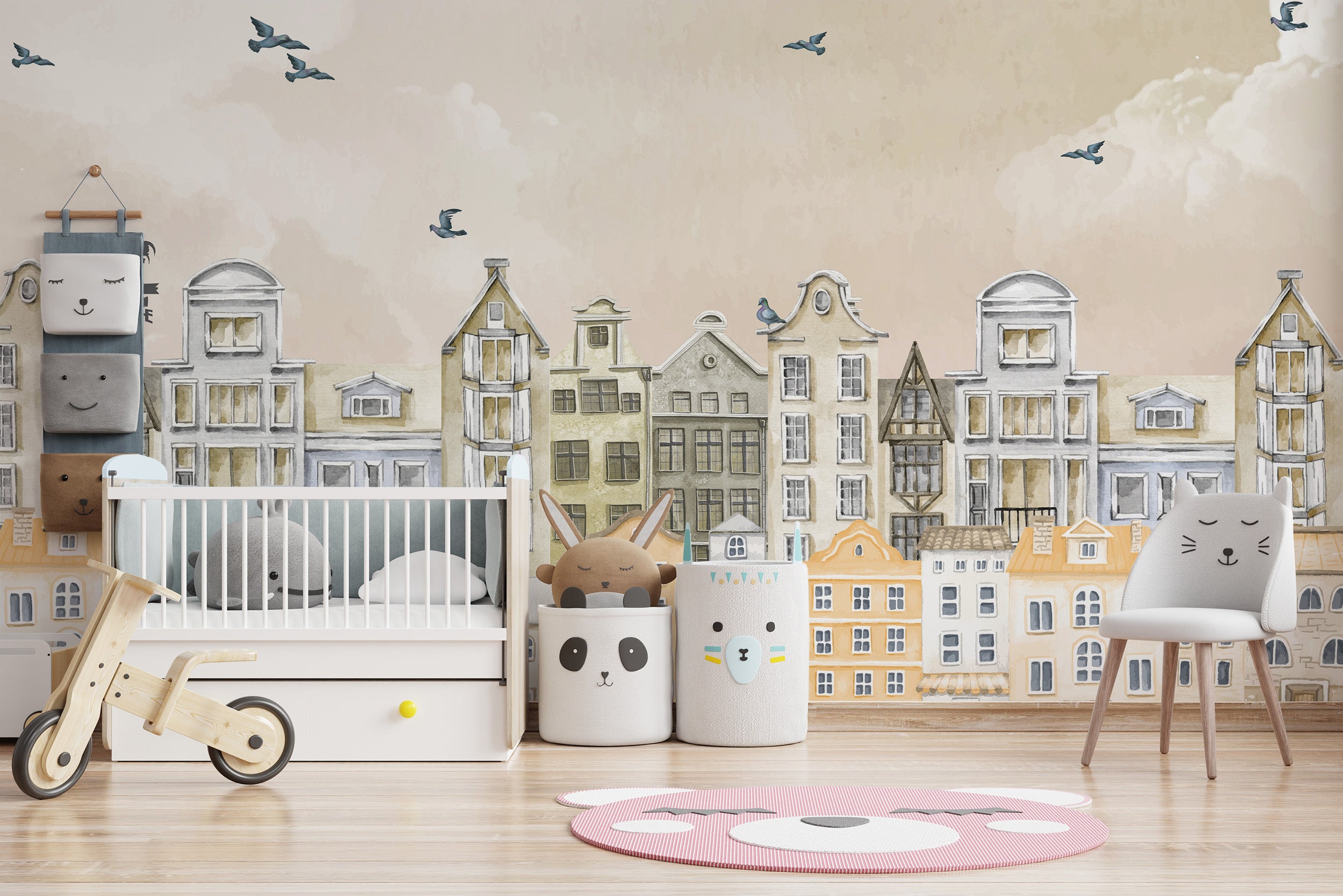 Subtle cityscape mural for kids' space