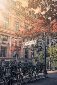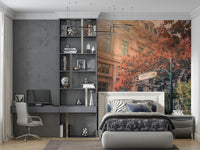 Step into the heart of Paris with this vintage-inspired scene. The classic 'Metropolitain' entrance framed by trees offers a timeless look. Warm hues of peach and red mix with cool greens, bringing a relaxed vibe to any room. Consider this wallpaper for walls to add a bit of Parisian flair to your living room, bedroom, or entryway. The design works well with both modern and classic furniture, filling your space with charm and style. The detailed building facade and bikes create a sense of place, adding depth and visual interest to your interior.