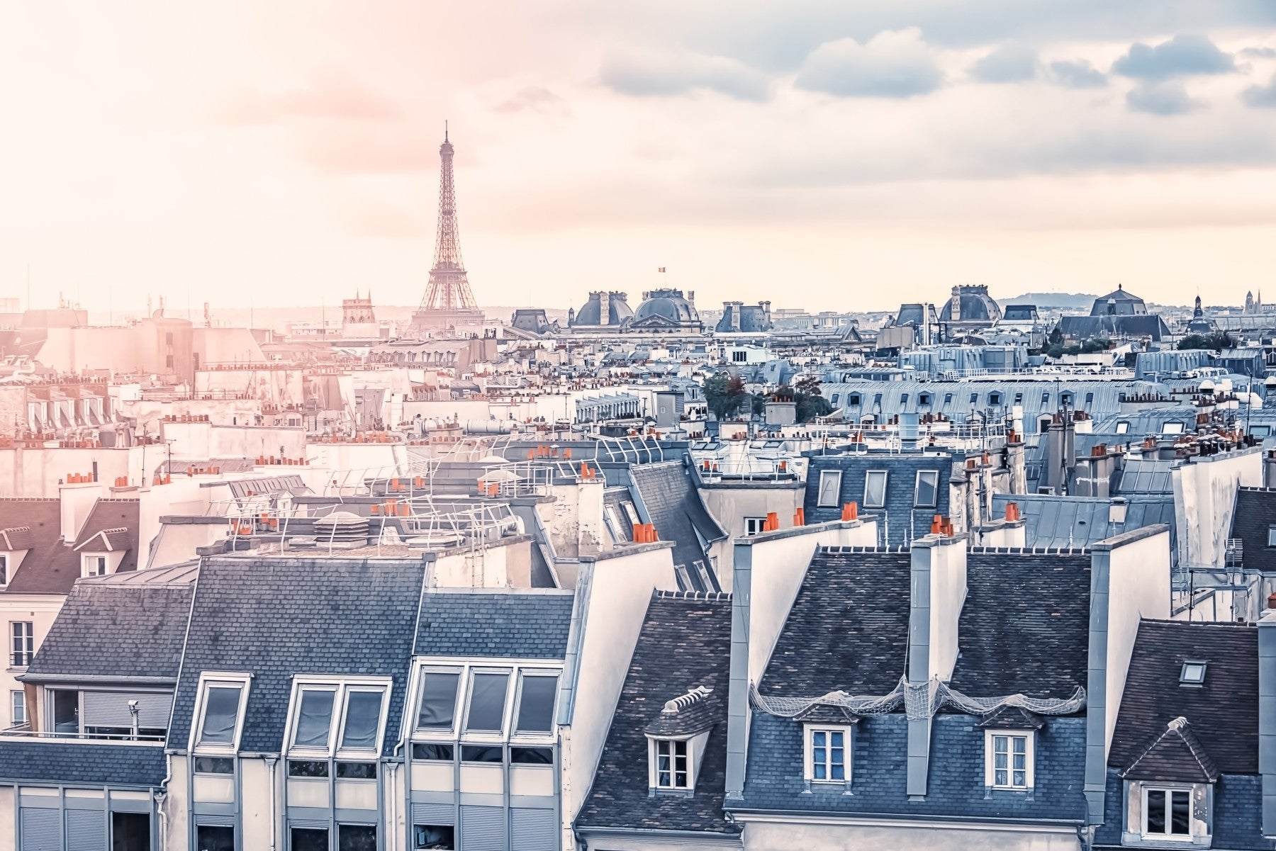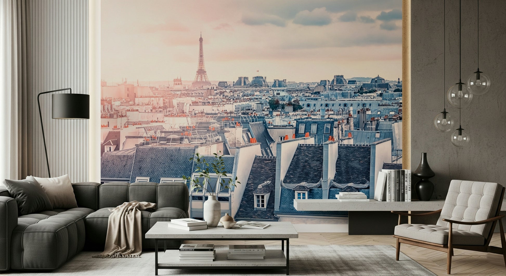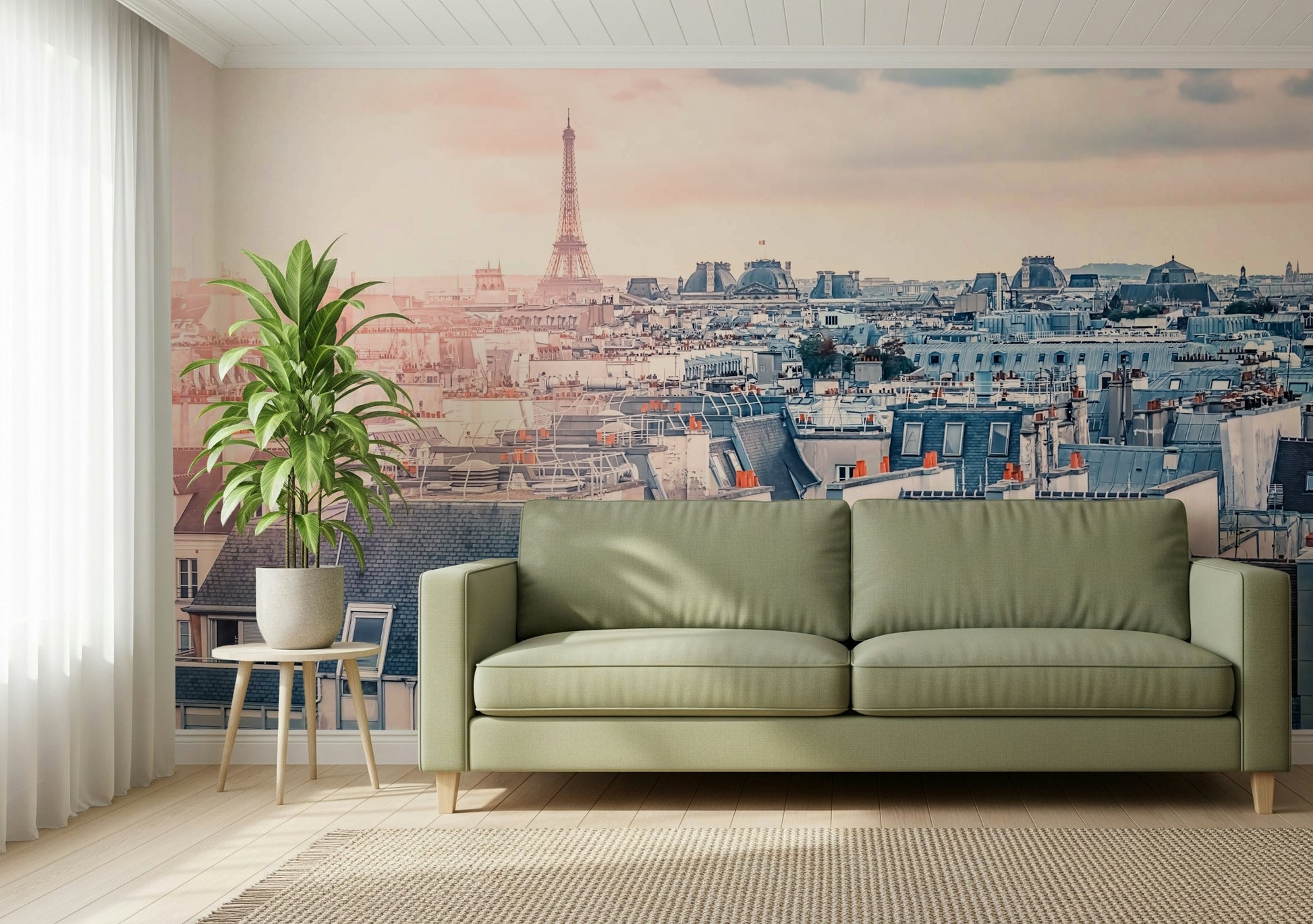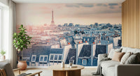 Capture the romance of Paris with this stunning wallpaper for walls. The design showcases a panoramic view of the city rooftops, crowned by the iconic Eiffel Tower. Soft pink and blue hues create a dreamy atmosphere, perfect for bedrooms, living rooms, or home offices. The subtle colour palette and detailed architecture bring a touch of sophistication. This wallpaper complements interiors with a blend of urban charm and serene beauty, transforming your space into a Parisian escape. It makes a statement without overwhelming the room.