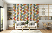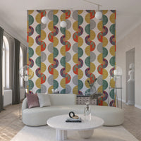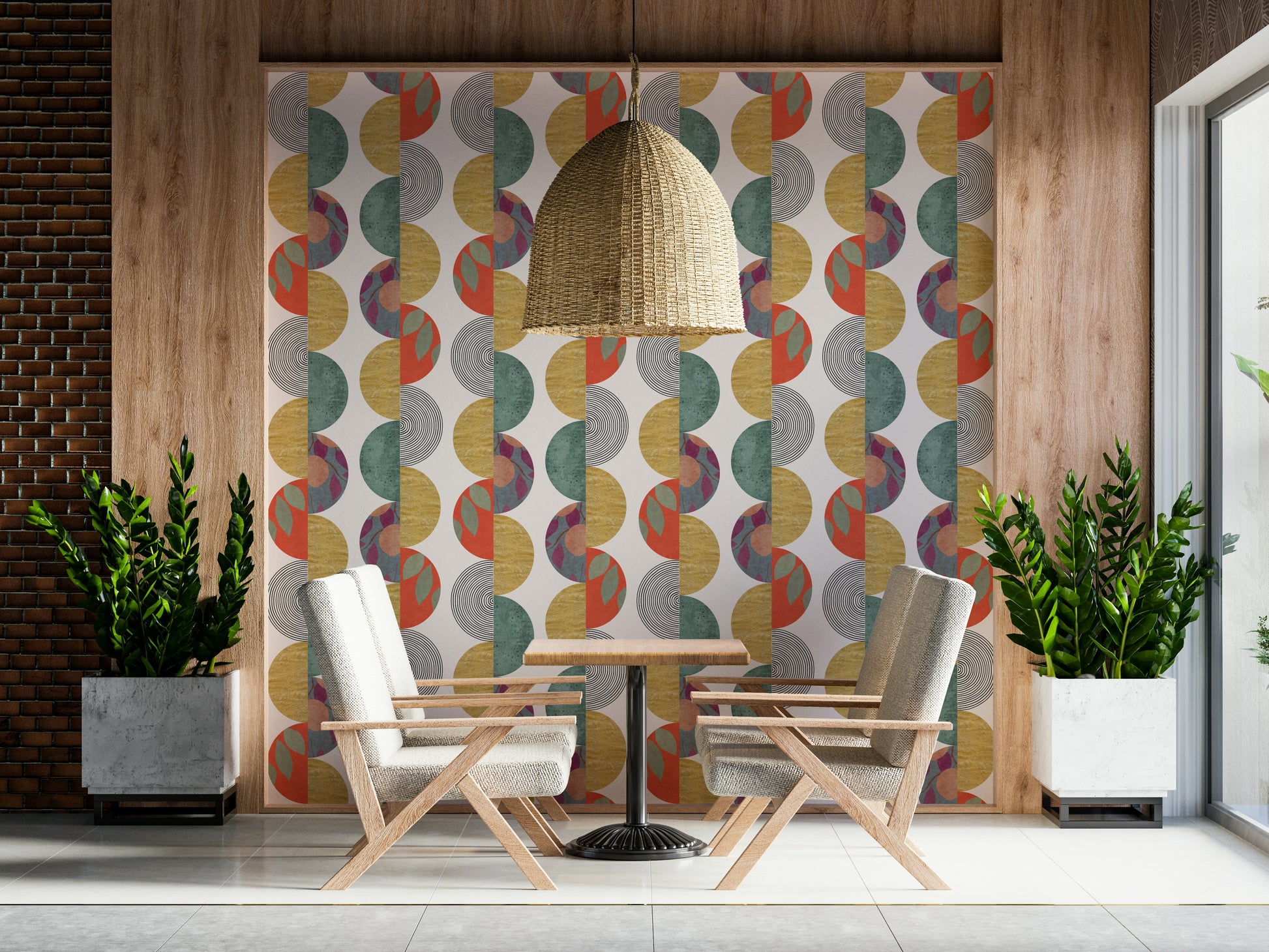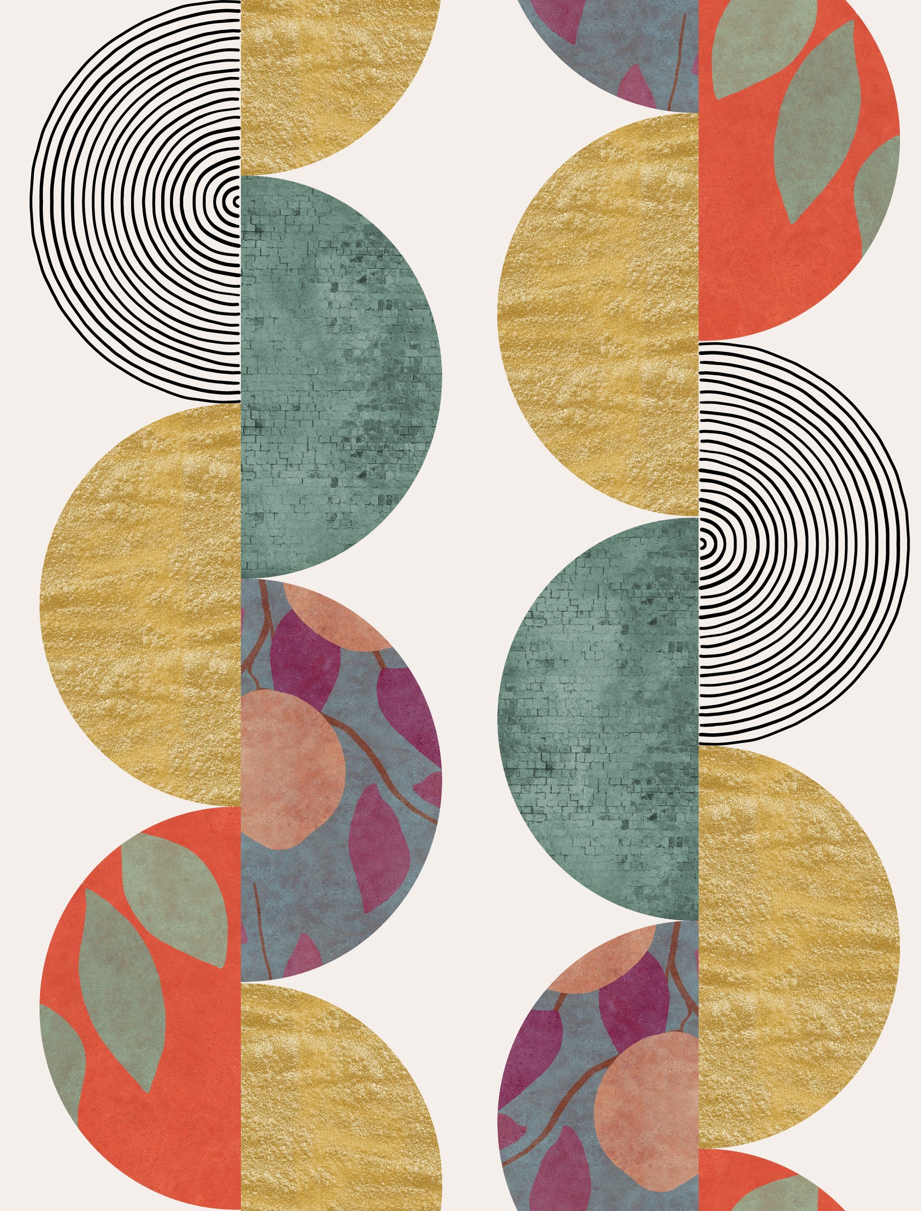 Unleash a playful yet sophisticated energy with 'Partywall', a modern wall covering that dares to be different. This captivating design features an array of overlapping circular motifs, each bursting with distinct character. From radiant, golden textures reminiscent of celebratory confetti to earthy, brick-inspired patinas in tranquil greens, 'Partywall' creates a harmonious blend of textures and tones. Bold graphic line-work dances alongside whimsical botanical patterns, adding depth and visual interest. Perfect for creating a focal point in any room, 'Partywall' is more than just a covering; it's a statement, a mood, and an invitation to celebrate style. Transform your space with this unique fusion of artistry and bring a touch of joyful sophistication to your home.