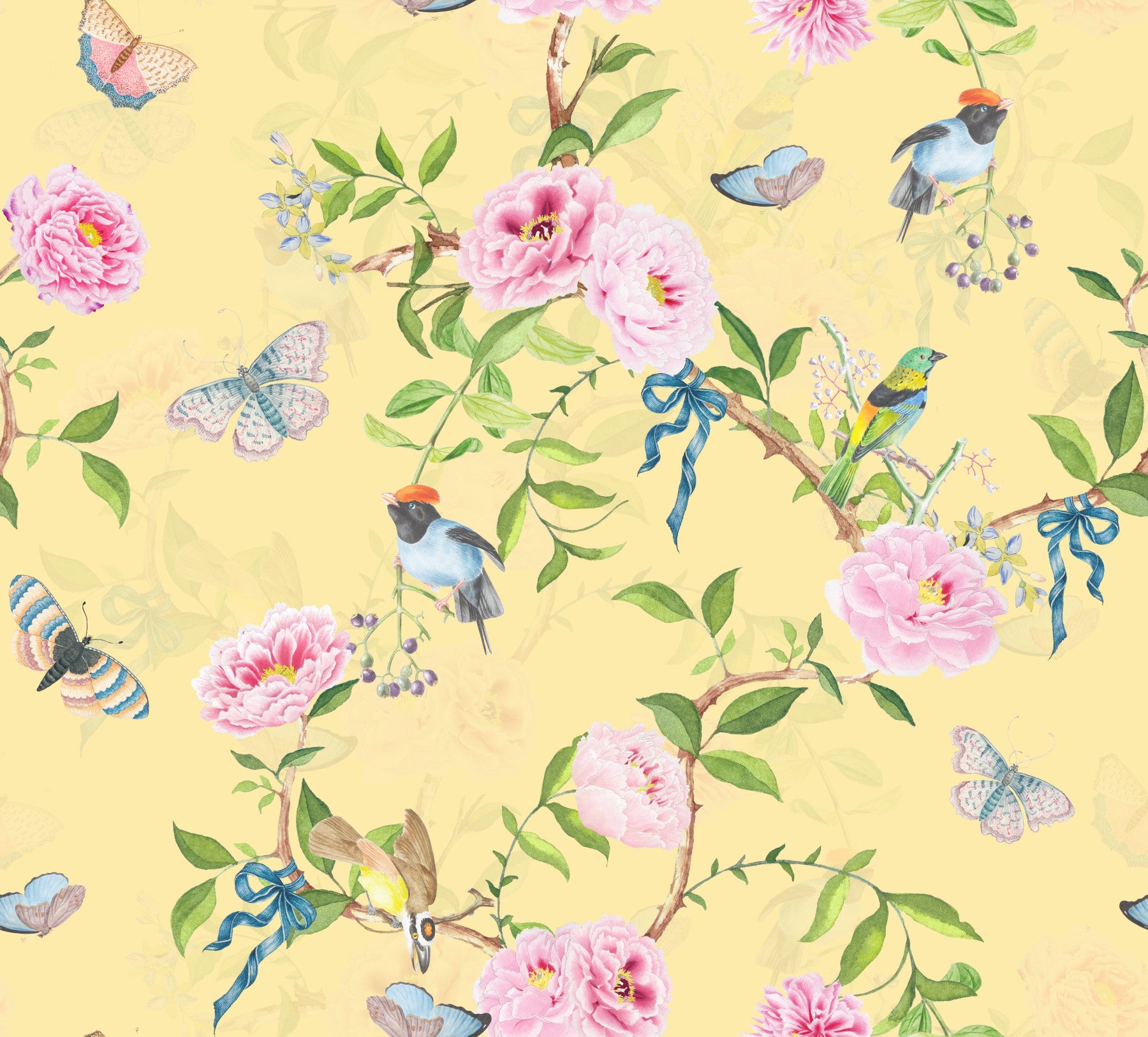 Pastel Paradise Chinoiserie Wallpaper with soft yellow background and birds.