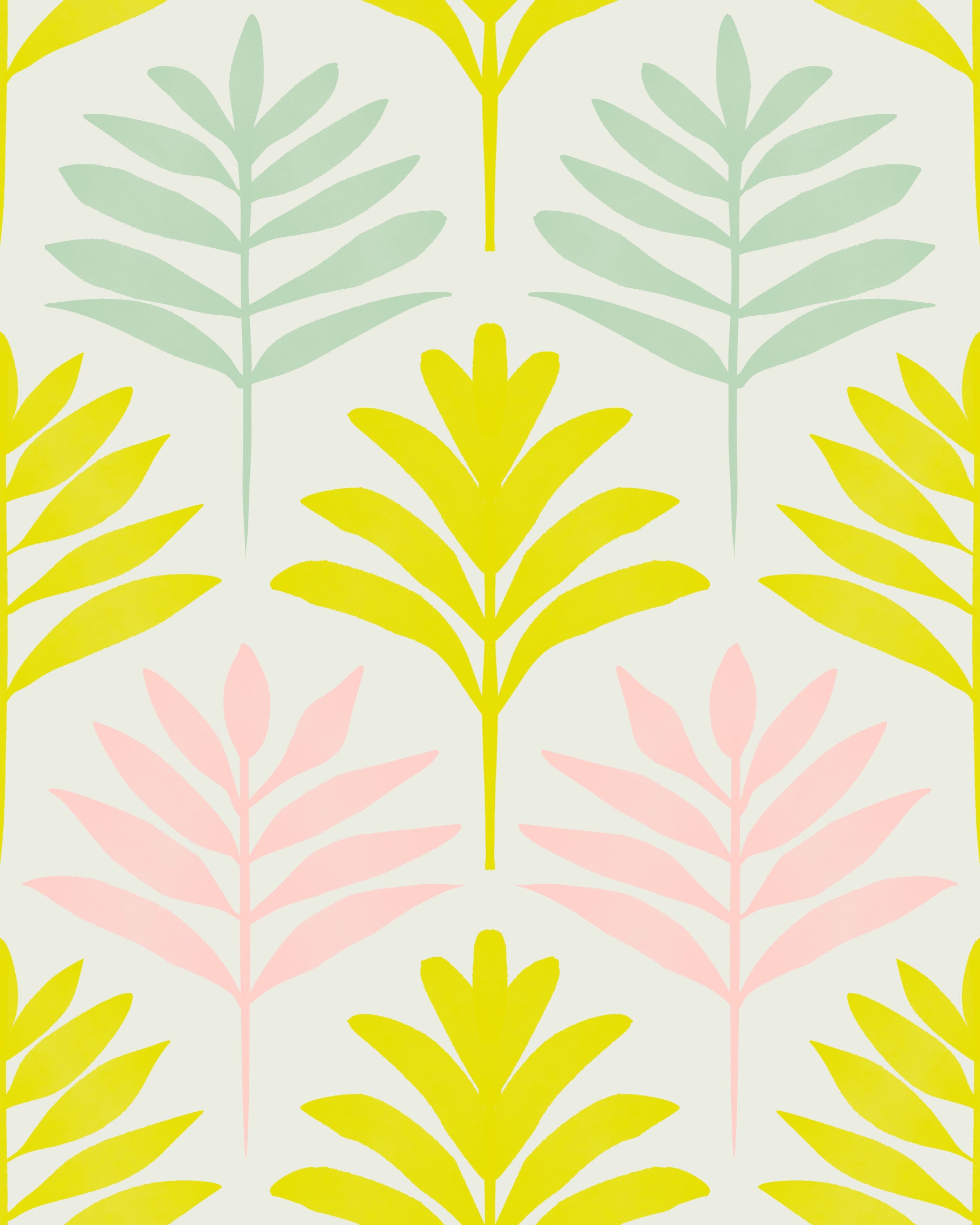 Escape to a tranquil oasis with this delightful wallpaper. Soft pastel hues of pink, yellow, and mint green create a calming atmosphere, while the stylized botanical pattern evokes a sense of serene nature. The repeating motif of simplified leaves and branches adds a touch of playful sophistication, making it perfect for bedrooms, nurseries, or any space craving a gentle and uplifting ambiance. This wallpaper's minimalist yet charming design infuses any room with a sense of peace and effortless style, providing a visually pleasing backdrop for your personal touches.